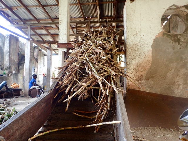 sending the sugarcane up the conveyor belt to be squeezed.