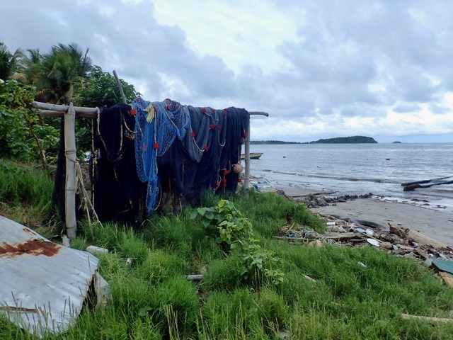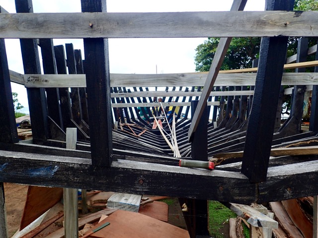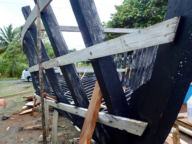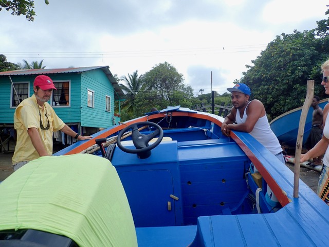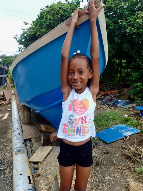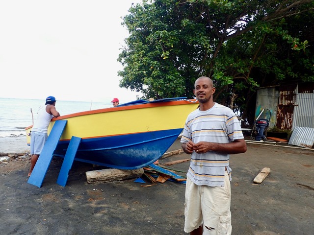 As we were driving along the northeastern side of Grenada, we passed a fishing village.  Some young men were hanging out around their boats in the yard by their houses.  They motioned for us to stop and take a look, so this was an unplanned bonus to our Cutty tour!  One of the men was the boat builder and the other was the boat owner.