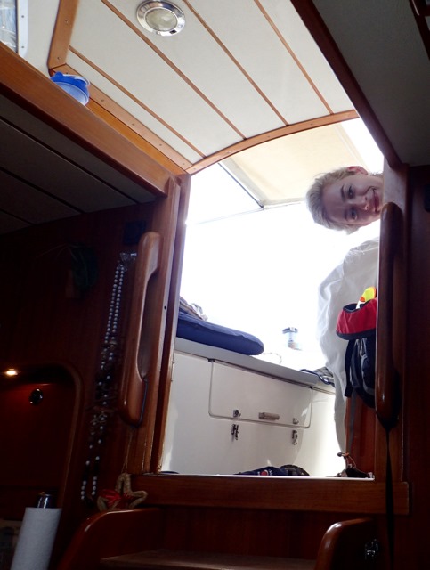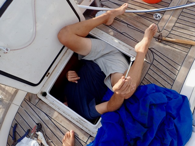 One of the first things on the long list that we did was pickle the watermaker.  Soon after, we dug out the window unit air-conditioner from under our berth and installed it in the companion way.  This makes climbing in and out of our cabin quite awkward, but the cool temperature is worth it!  The main reason for the air-conditioner is to keep the humidity down so that mold and mildew don’t grow while the boat is all closed up while we’re gone for the off season, and it works great!