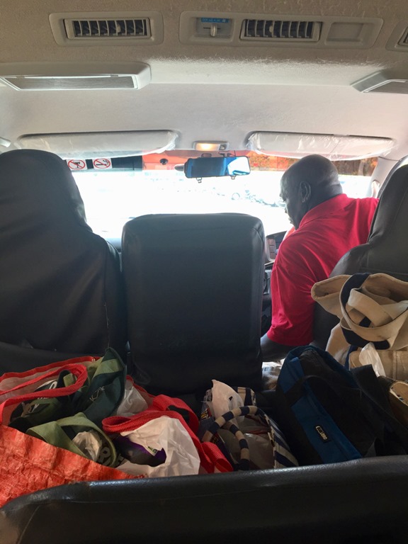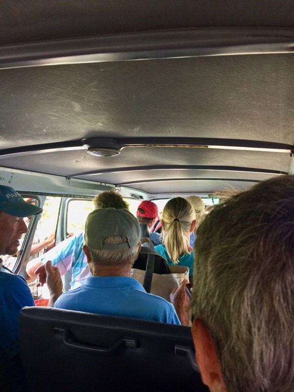 Then there’s the piling of EVERYONE’S bags in the bus.  On this particular trip, our bags got their own seat in the front by George, our regular driver—not same.