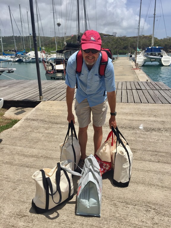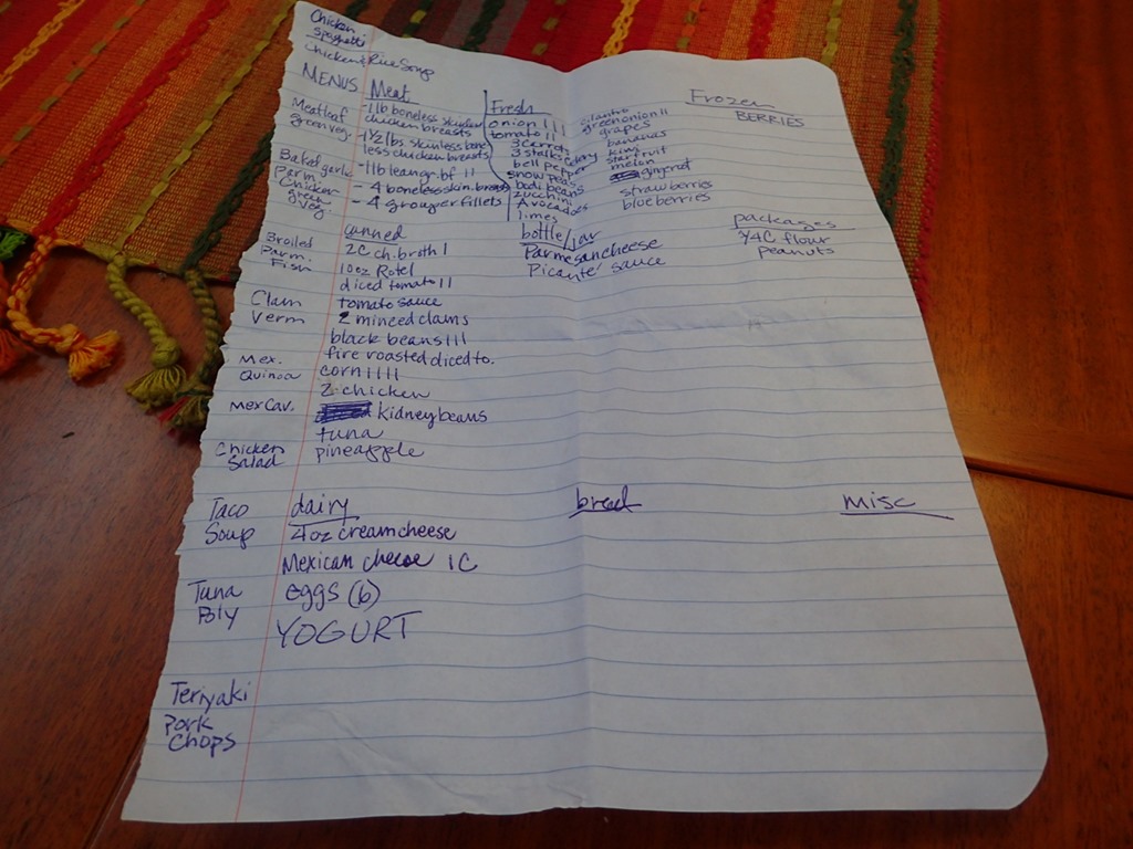 It all starts with a list—same, well, unless you’re provisioning for a place and time that you know access to groceries will be limited.  If that were the case, the list would be loooong and there would probably be multiple shopping trips.  That wasn’t the case for us anchored in Mt. Hartman Bay, Grenada.  We were just doing weekly shopping.