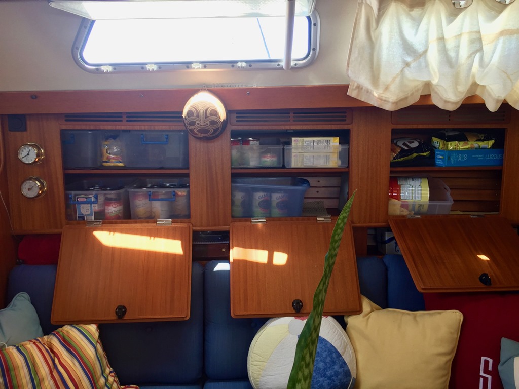 We have identical sets of 3 cabinets on the starboard and port sides of the saloon.  That is my pantry, with super easy access for which I am very grateful.  The saloon is the equivalent of the living room in Texas, so—not same.