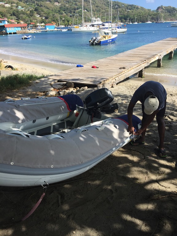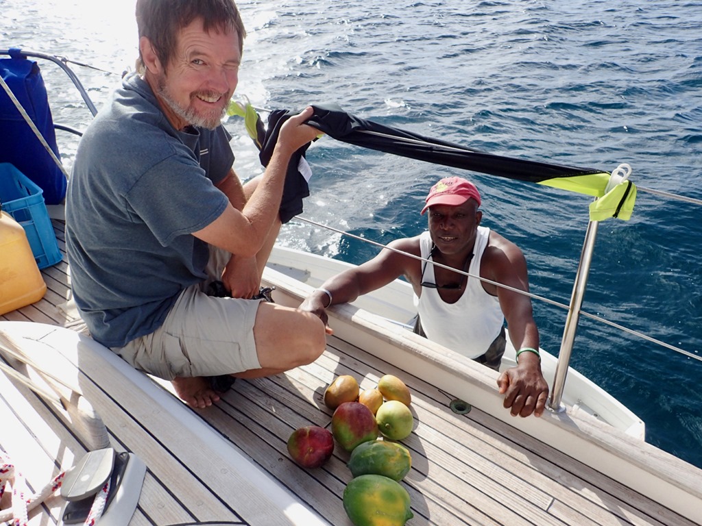 Mark advertised on the radio net that he had some dinghy wheels and a seat to sell.  Unlike most places we’ve been, here in Bequia, the net (morning community information program) is run by a local woman instead of cruisers.  Local people listen as well as cruisers.  A gentleman was interested in the dinghy accessories.  He ended up purchasing them for a bunch of mangoes and a couple of papayas—score!