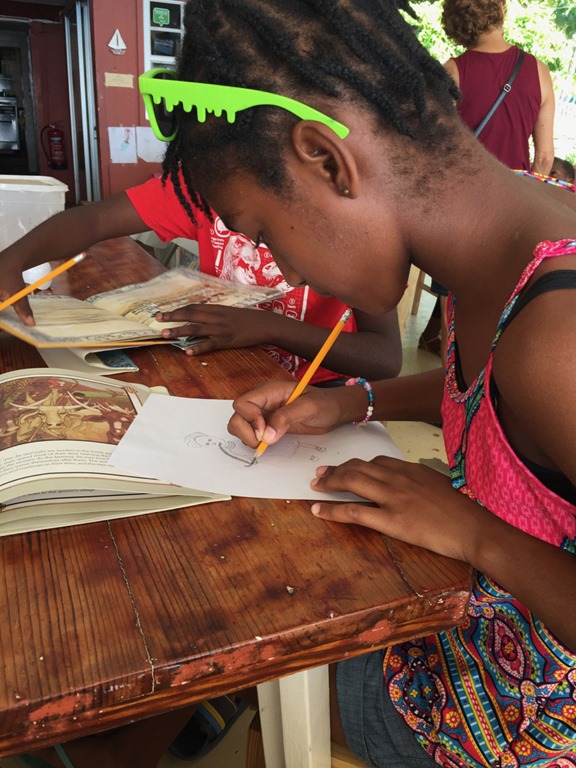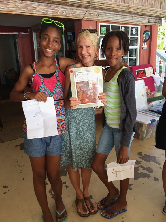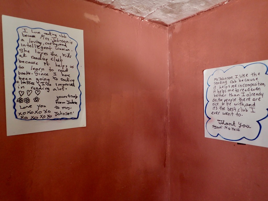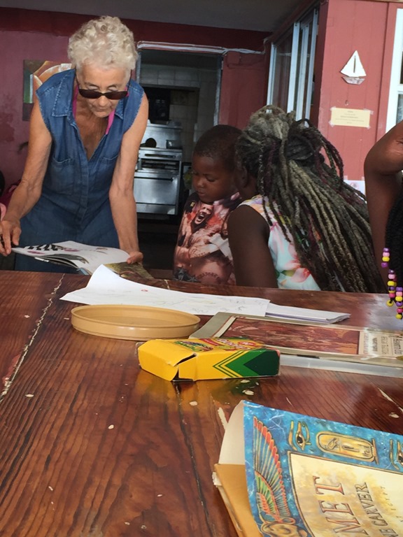 and from the restroom walls in the restaurant that Cheryl Johnson, the owner, has been hosting a children’s reading club at Fig Tree every Saturday for eleven years.  She invites cruisers to volunteer to help, which is right up my alley!