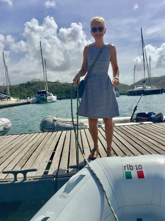 Next, comes a dinghy ride to the dinghy dock—not same, well, unless you consider your dinghy analogous to your car, but I think not.  A dinghy is too different from a car.  A few differences are:  you have to climb onto what sometimes feels like a bucking bronco, you manually pull a starter cord to start the engine, you get a little wet even on a sunny day’s drive,