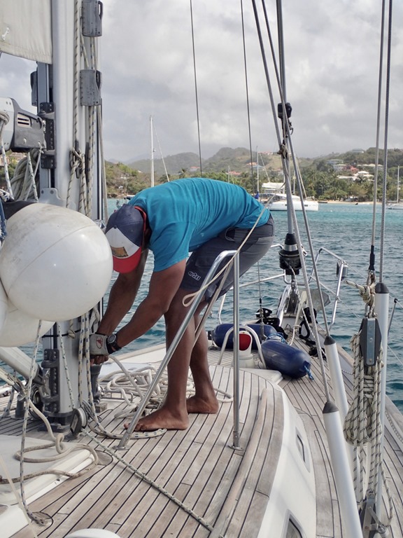 anchoring in rolly Prickly Bay, Grenada, where we got some work done on our rigging.