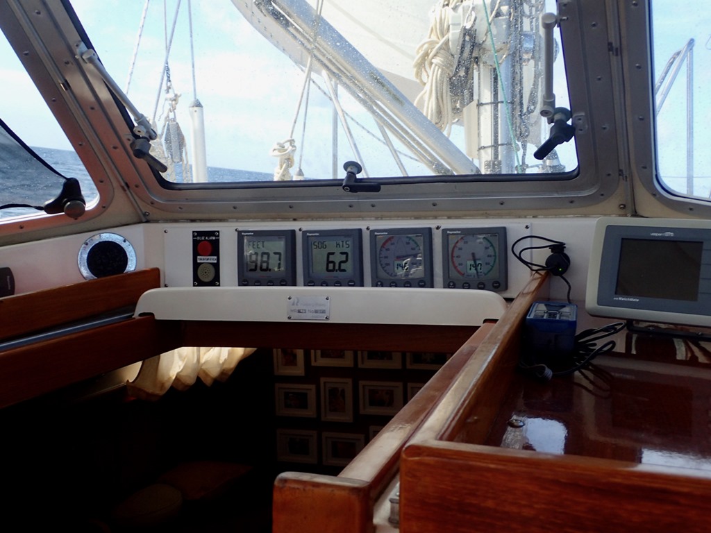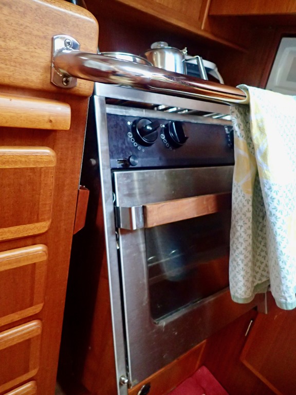 Sometimes, I cook, well, mostly just prepare food when we’re sailing.  Sailing causes the boat to heel over.  It’s hard to get a picture that shows the angle of the heel, but the shot of the gimbaled stove and the water coming out of the faucet at an angle comes close—not same!