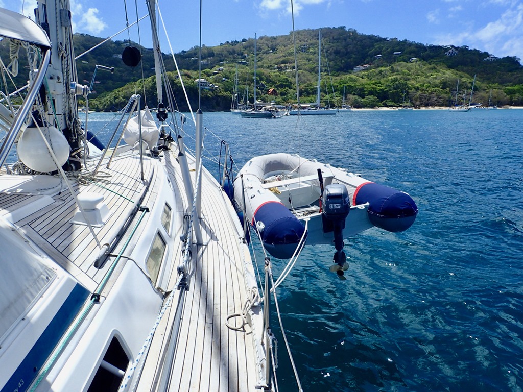 We got a new dinghy.  We decided to go with a new brand—Zar.  Mark’s securing it to our dinghy davits.