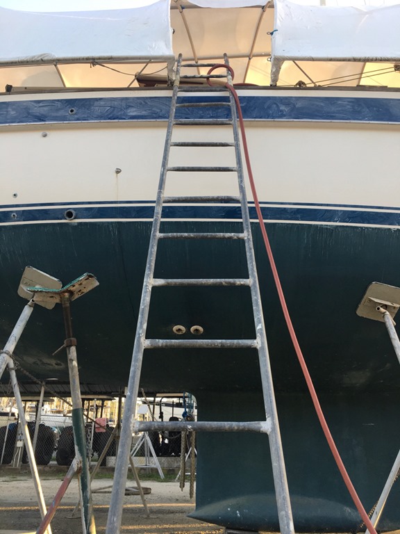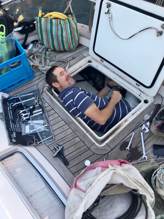 At Crews Inn, we continued to get Nancy Lu ready to sail. Sometimes this means getting into some tight spaces!