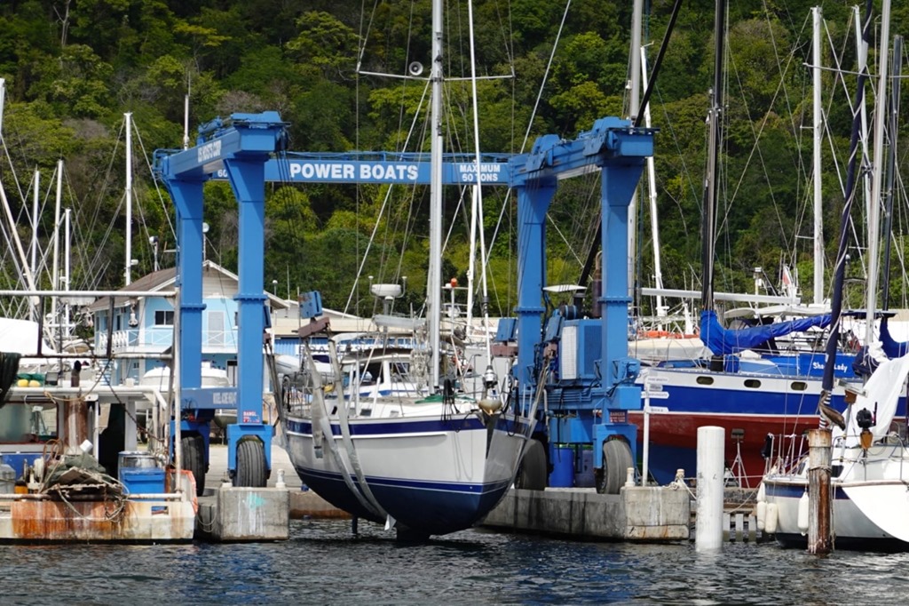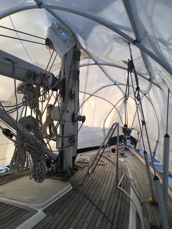 She was also ensconced in shrink wrap which did a good job of protecting her decks from the downpours of rainy season and keeping the cabin relatively cool.