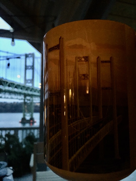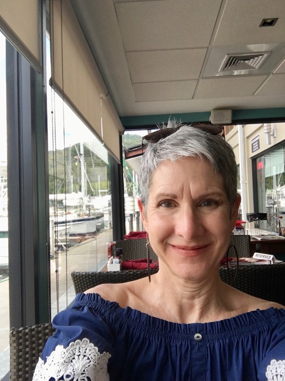 My little sister, Jenny, and brother-in-law, Bob treated me to lunch on the way to their home from the airport after my overnight flight. What a great way to reacclimatize to winter! The scene through the restaurant windows was similar to where I had just left, with a harbor and boats docked in a little marina close by…except for the light fall of SNOW—just a little thing, haha!