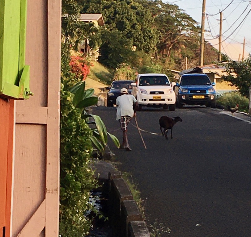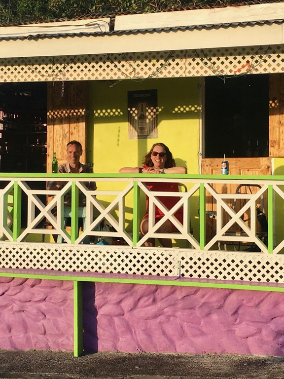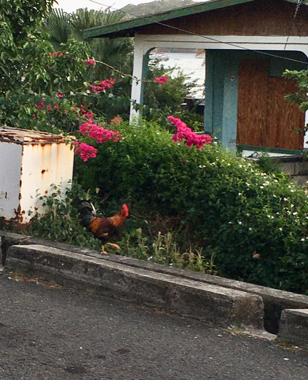 At the end of both free dive adventure days, we disembarked the #2 bus at Woburn close to where our boats were anchored. We enjoyed a drink and a sit on the porch at Kelvin’s little bar where we could take in the activity on the street. The first evening, just past sunset (too dark for a picture), we saw something none of us had ever seen before… the roosters called their hens home to roost in the TREES! Kelvin told us that’s what happens every night! Turns out that is where the free roaming, hardworking, island chickens with NO COOPS sleep at night! I’ve always thought of the island chickens as the REAL DEAL as opposed to the pretentious, pet chickens which are a part of the American trend of raising chickens in backyards, HAHA! I don’t know why these Caribbean chickens have always captured my attention and imagination! I love to hear them crowing from our anchorages and see them strutting through open air restaurants. They just seem to symbolize a simpler and less pretentious way of life. Maybe it’s just me…