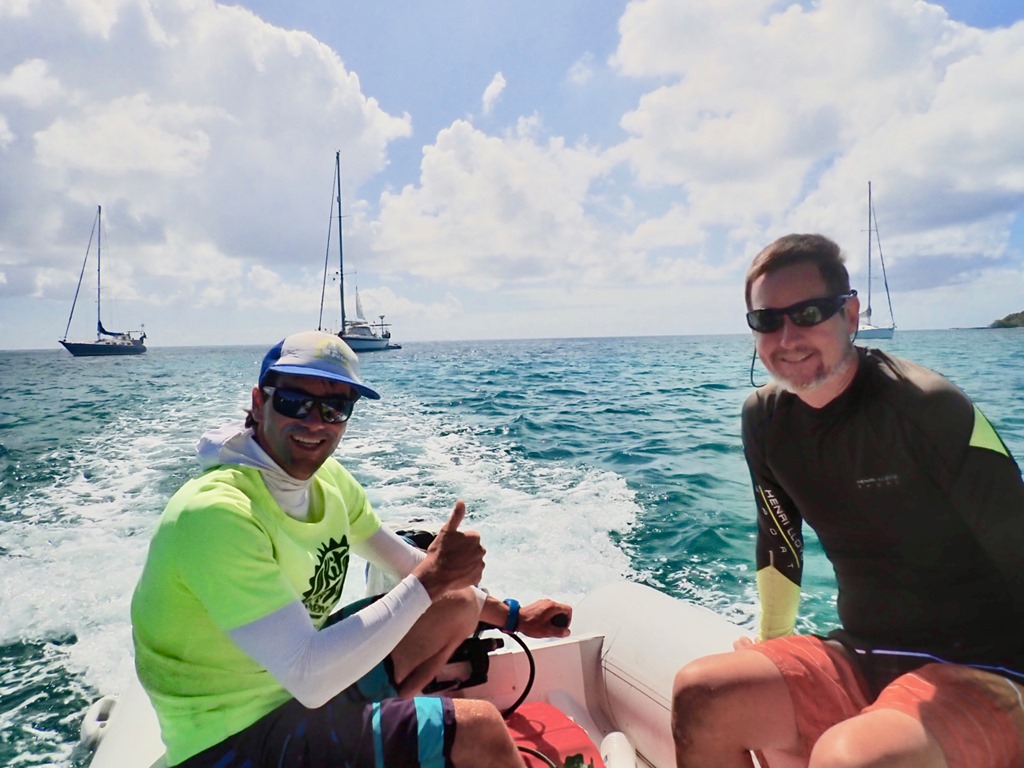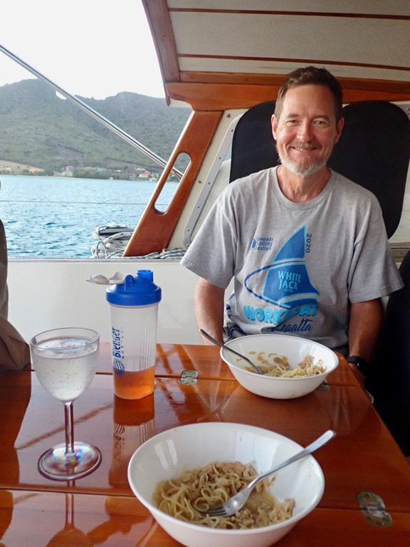 Our first stop after Grenada was Tyrell Bay, Carriacou. We had a nice sail there, and anchored “next door” to our friends, Hal and Marcia, on S/V Eagles’ Wings. Little did we know that we would be anchored with them for 42 out of the next 50 days… and counting! We got anchored just in time for the weekly, Sunday afternoon gathering for Mexican Train Dominoes at a restaurant on shore. We weren’t in Carriacou for long (hard to imagine a short stay somewhere in this COVID-19 time), but given the mere 2 full days there, we did a lot OFF the boat WITH other people… Monday- noodling (ocean aerobics with a pool noodle) and Tuesday- yoga in the morning and burgers at Citi Grill in the evening (YUM).