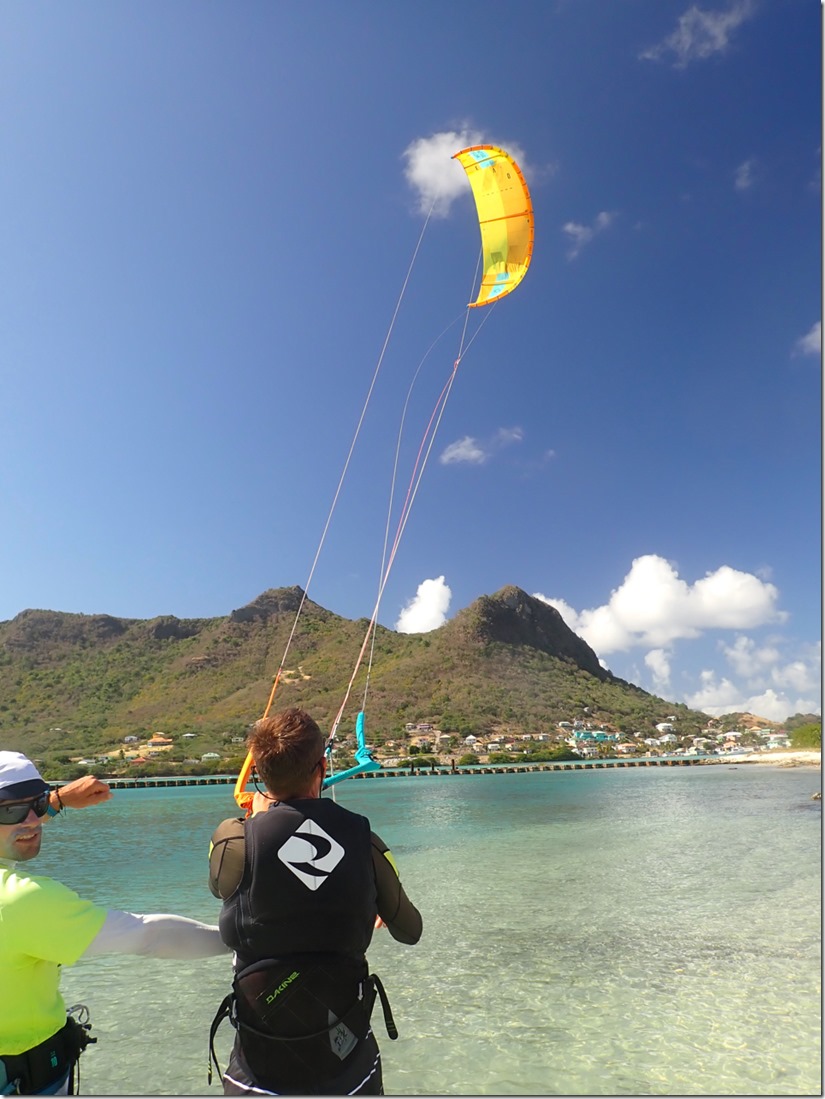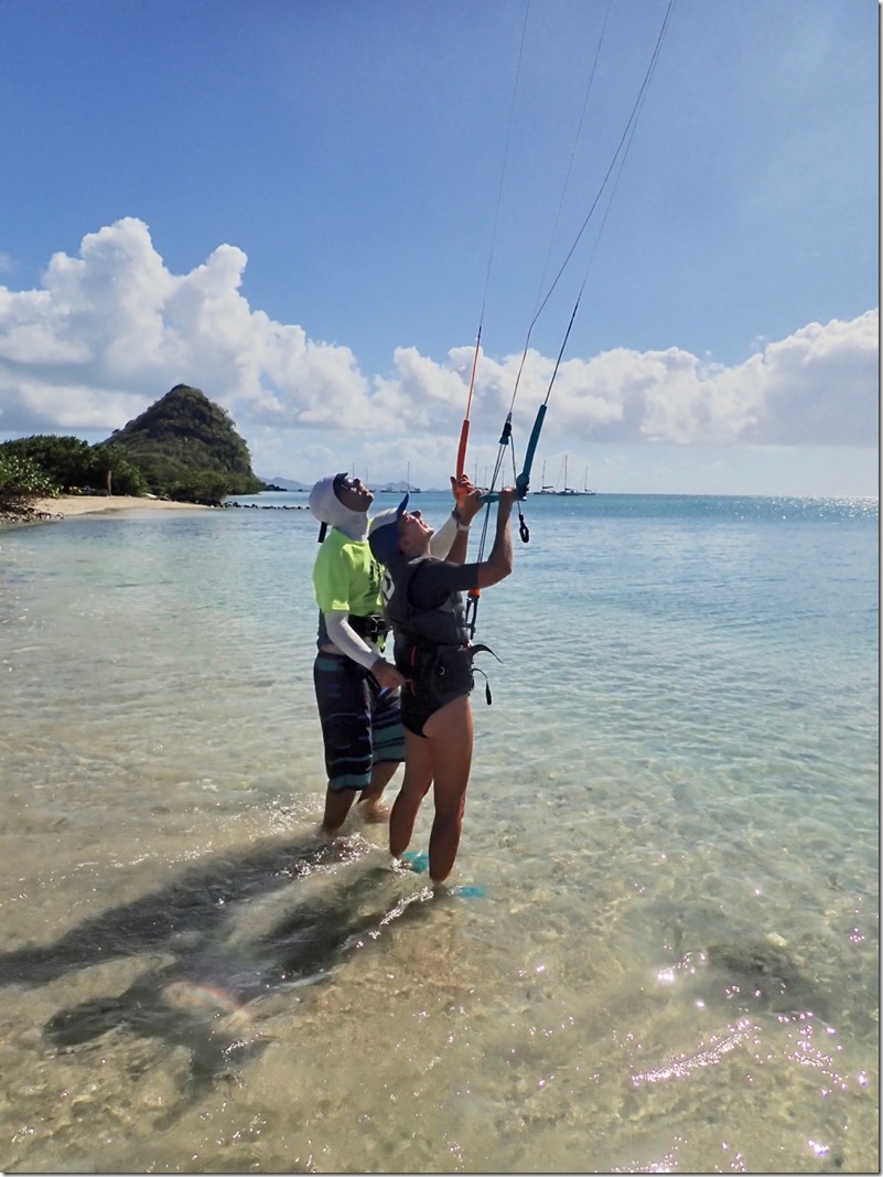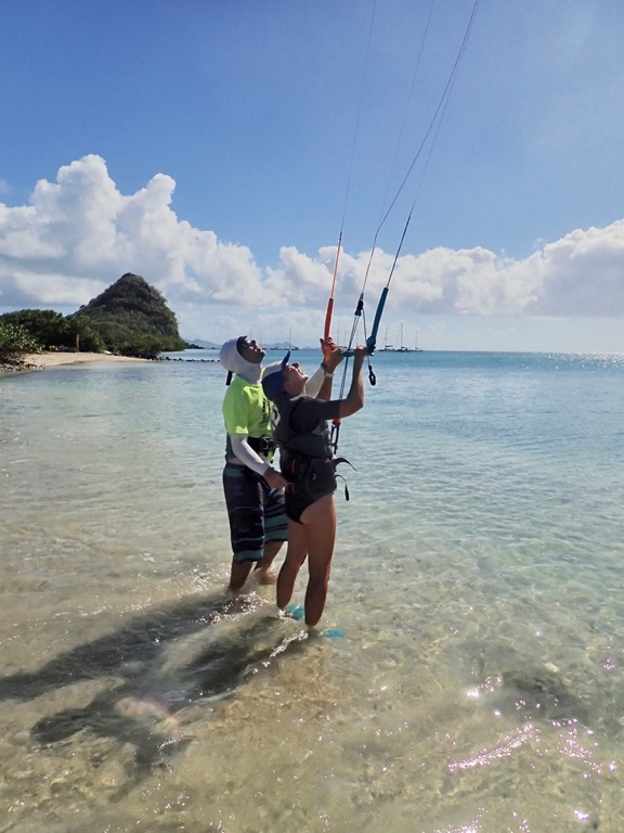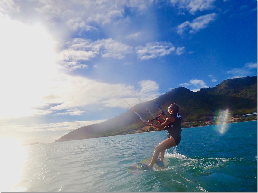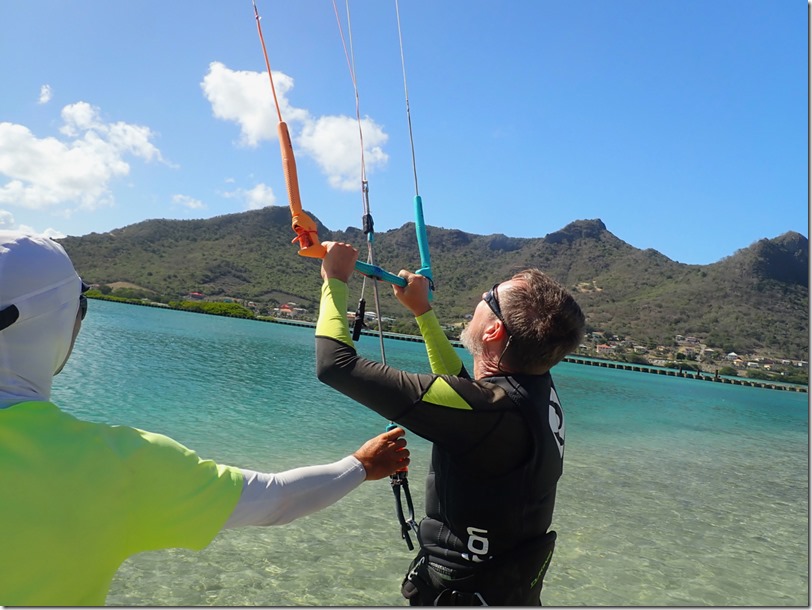 Then, we worked on kite control from the shore. At this time, my shoulder was still quite compromised from my Grenadian hash mishap. I almost bowed out of giving it a go, but I’m glad I didn’t! Kite boarding is surprisingly easy on the shoulders.