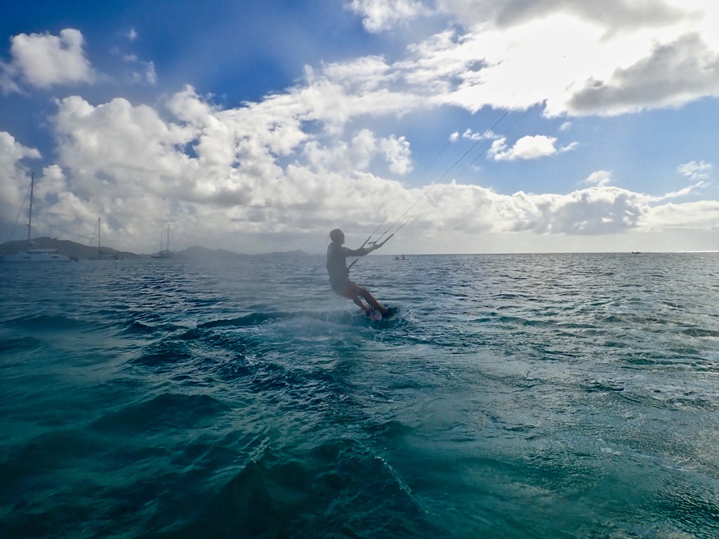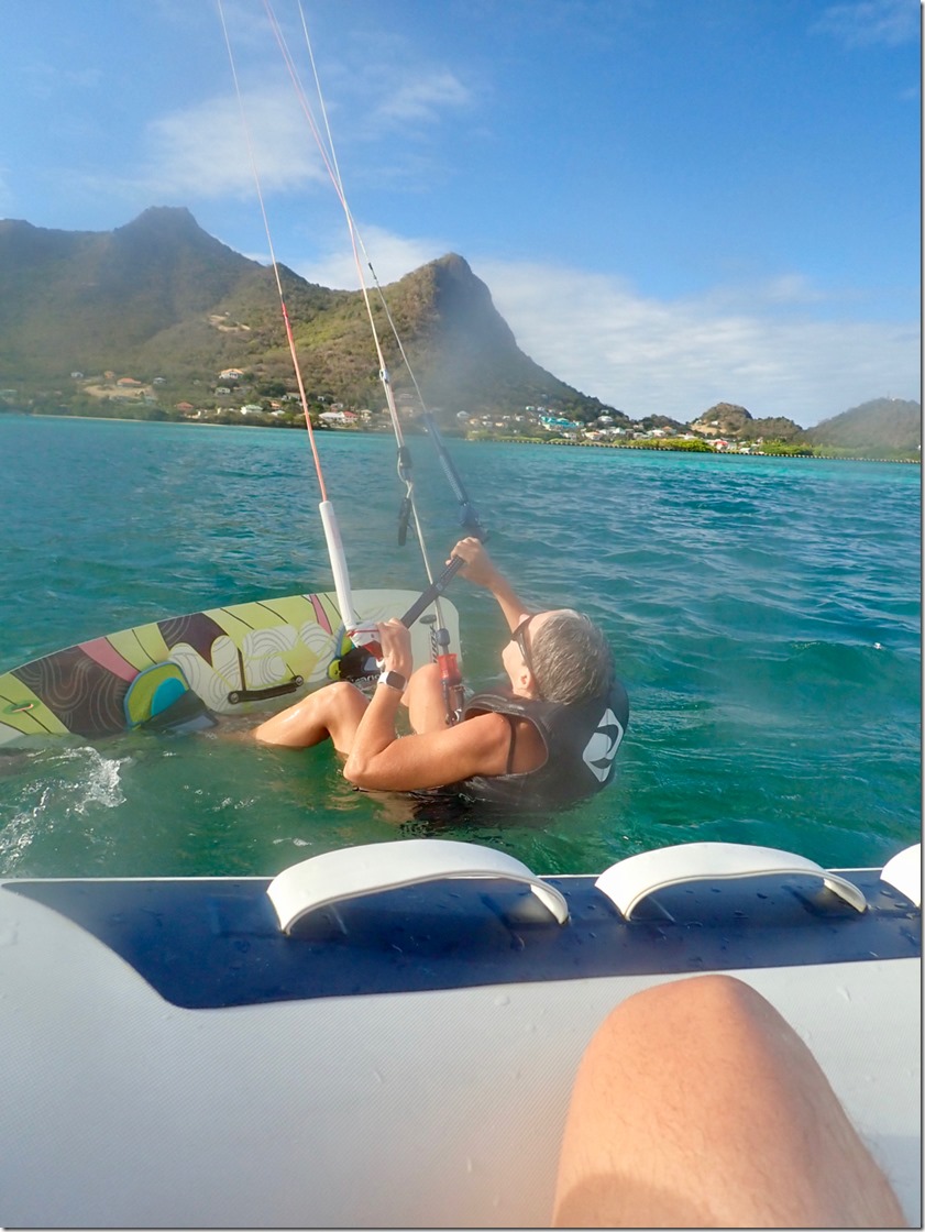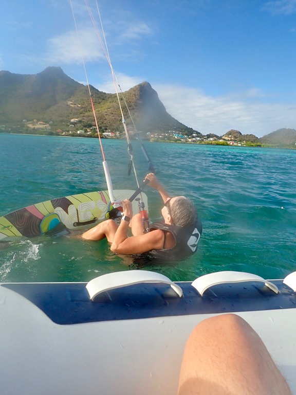 Getting back in the dinghy after a turn at the kite board was a feat in itself! We’re both used to having fins on to give us the extra umph to make it in. It’s much harder without them!