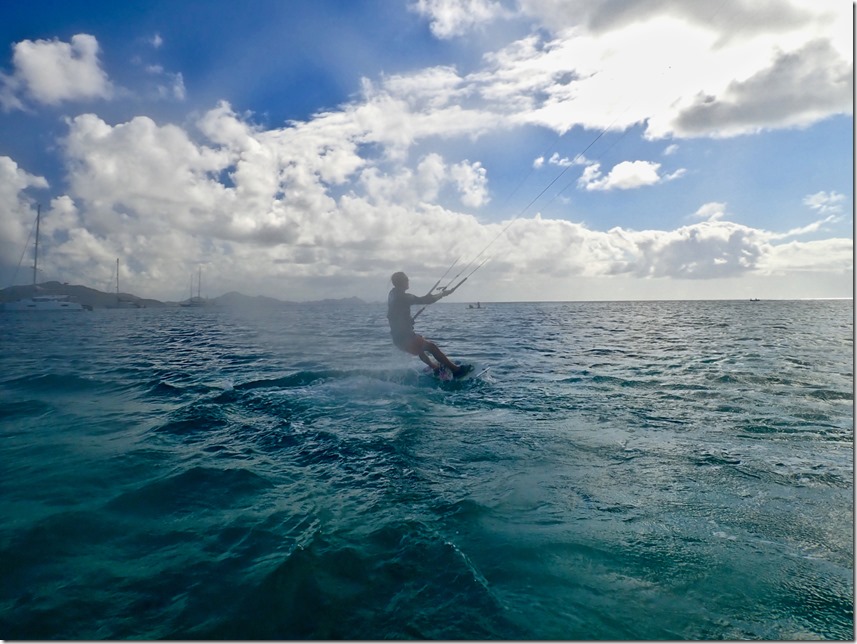 After our kite boarding interlude, we sailed on, along with Eagles’ Wings, the short distance to one of every cruiser’s favorite islands,