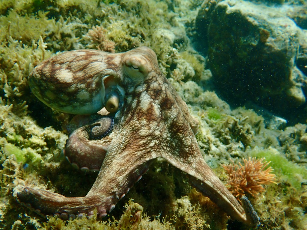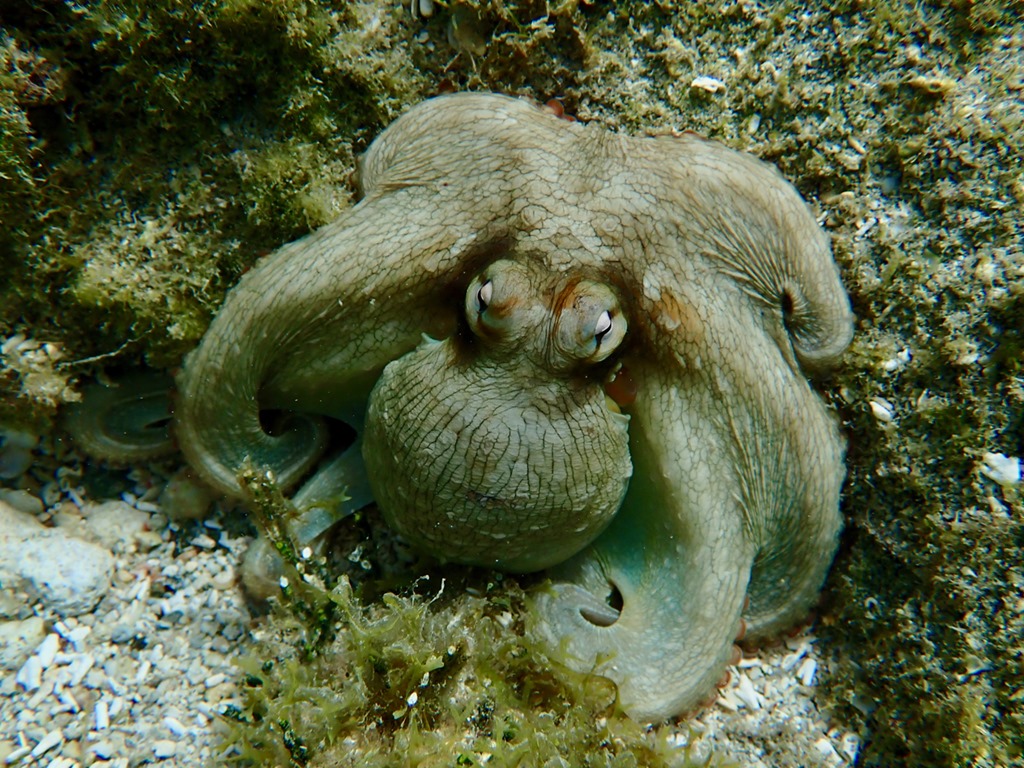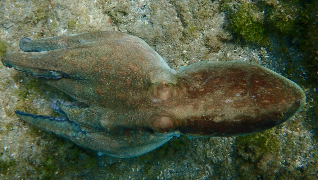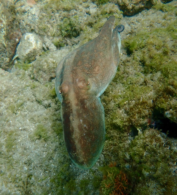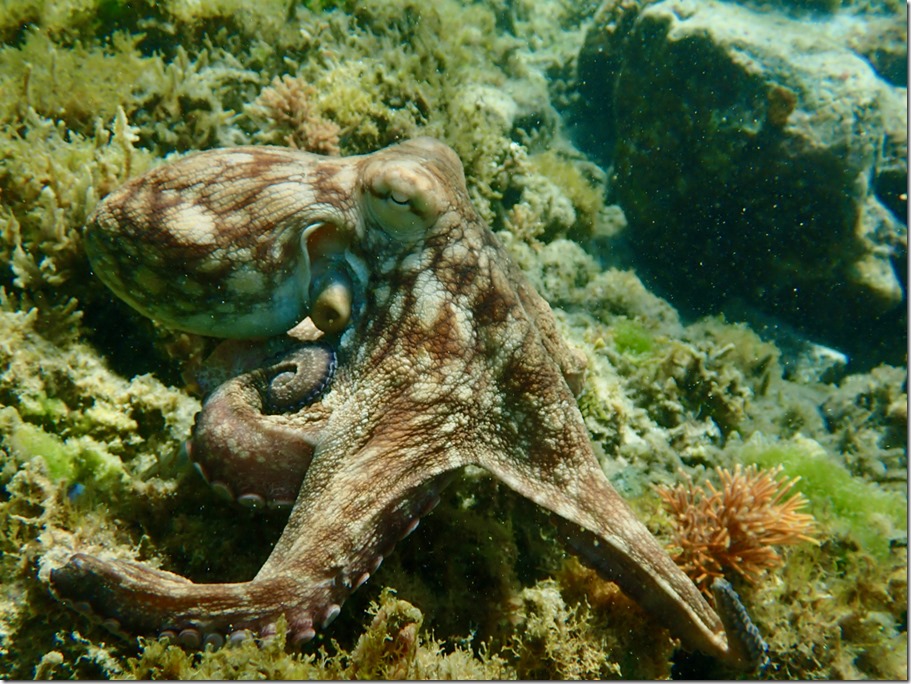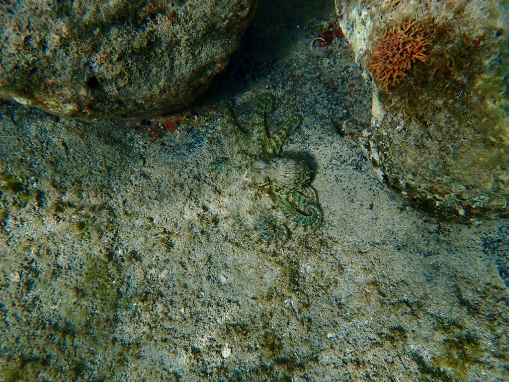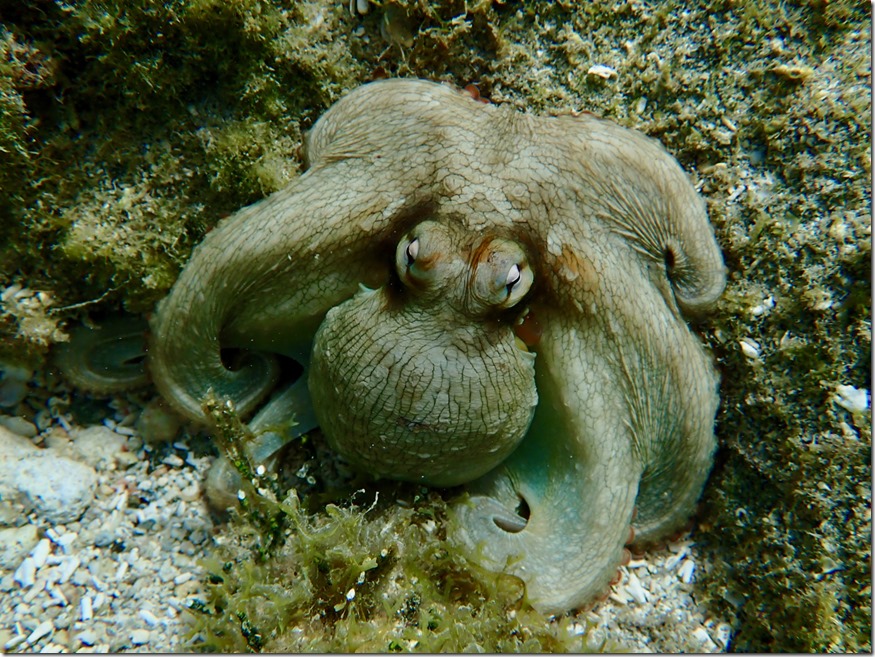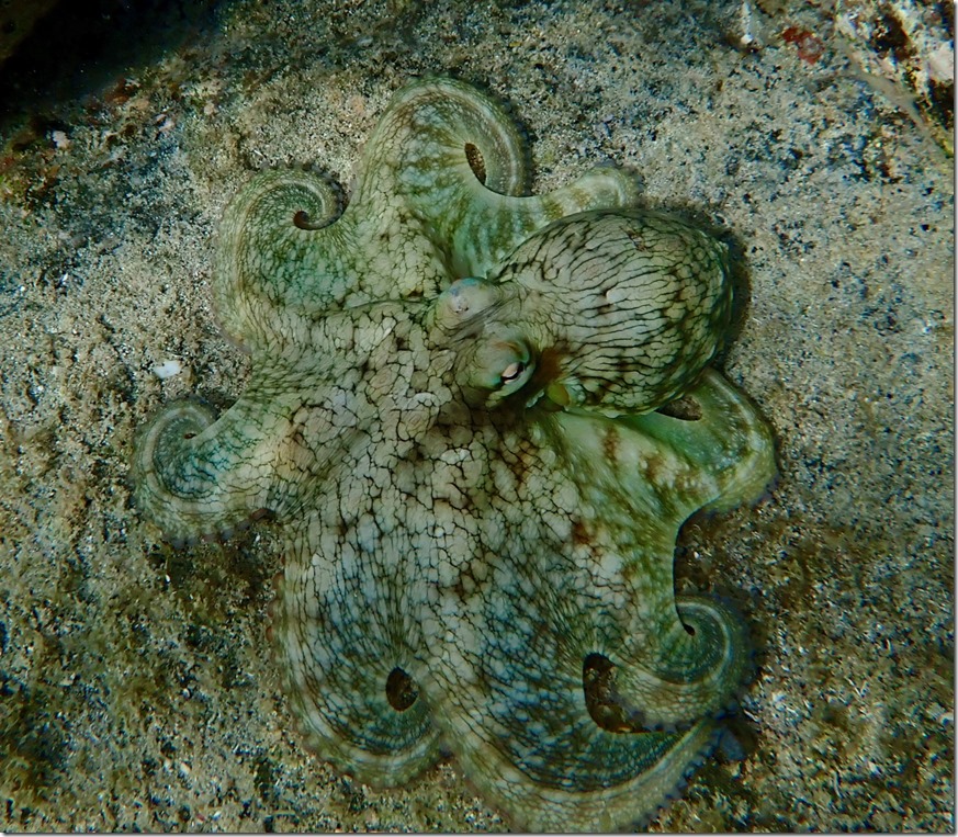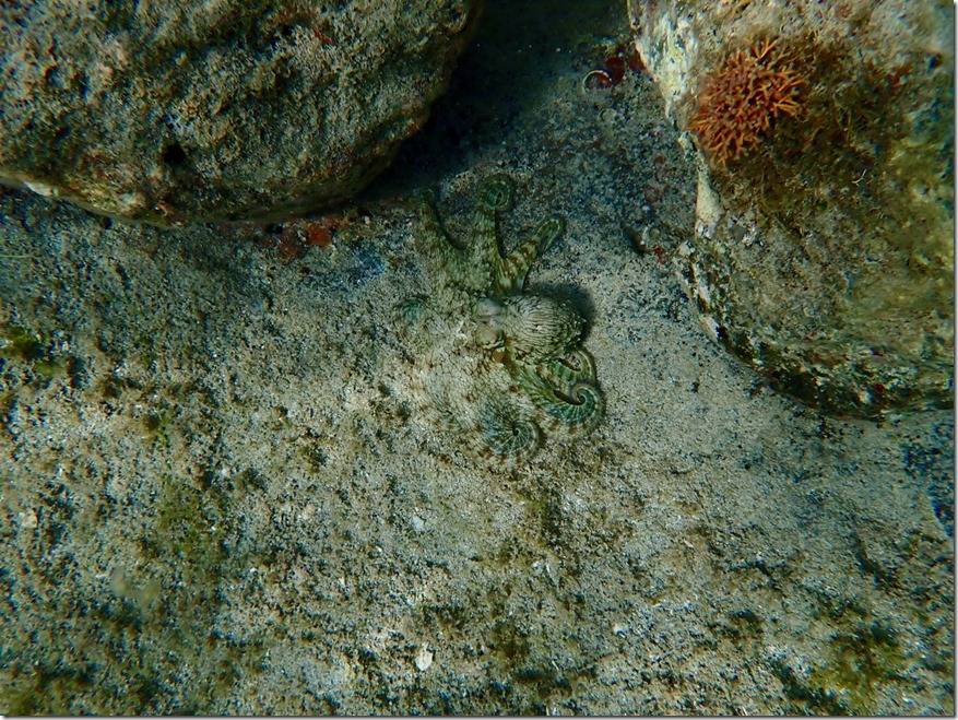 When Mark swam close to where I was obsessively photographing the little octopus, he pointed out a big one. This one looked rather worse for wear. He had some tentacles missing, but it was my first sighting of a an octopus the size you normally think of them being! I was excited!