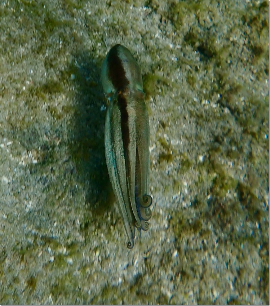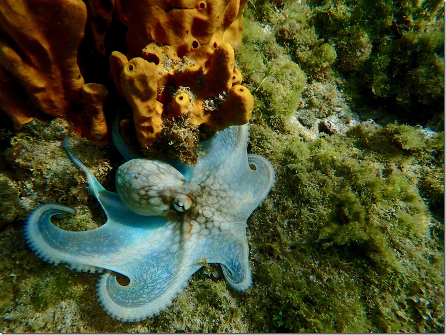 First, I spotted the small one just ambling along the ocean floor. When I would swim towards him, he would change to the bright and beautiful whitish-blue color, but once he calmed down, within seconds, he would fade back into camouflage. He was much smaller than he appears in the close-up photos—about the size of a large platter when splayed out with all 8 tentacles curling gracefully around him. He finally found his way to a good hiding spot in some tube sponge.