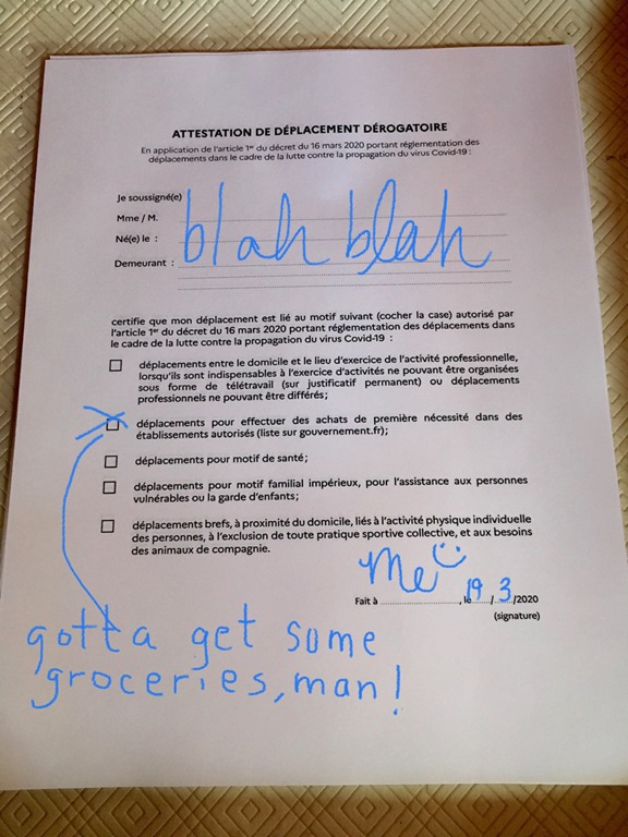 - Must carry an “Attestation De Deplacement Derogatoire” –Basically, a paper that tells why you’re out of the house, which you are required to show the police at their request