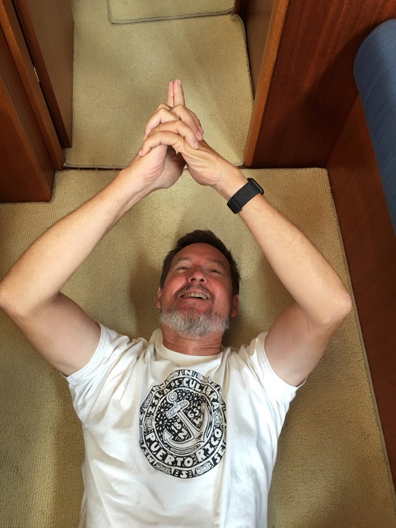 he gave that up for using some of my weights to do a “stair-stepping” routine in which he steps from one level to a higher level of the deck at the bow of the boat. I’m pretty proud of him!