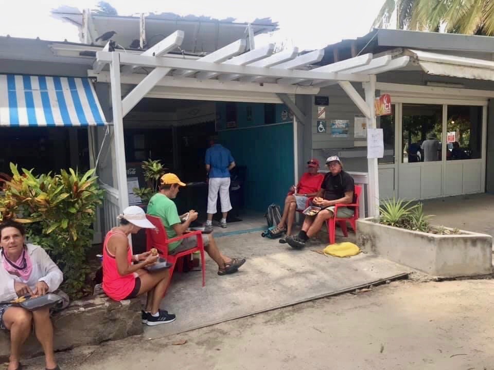 we have *BAGUETTES EVERYDAY*! Isn’t there a saying, “A baguette a day keeps the doctor away”? Besides the few groceries that we buy everyday from Juliette and Guerric, we get things that they don’t carry when Mark goes into Ste. Anne or Le Marin once a week or so. He’s had to go into Le Marin to patronize one or two of the limited number of stores open to get boat parts and necessities a few times, as well. As for me, I got off the boat a total of ONE TIME during the long period of lockdown (March 16 thru May11). Serious homebody ninja cred, wouldn’t you say?! It’s worth noting that my birthday fell within that time frame! That one outing was to keep Mark company on a mile walk to the gas station for some cooking gas. This is the first time I had put shoes on my feet in 46 days—I got a blister! I wasn’t incentivized much by that experience to get out again until the lockdown was relaxed and a cheeseburger was on the agenda!