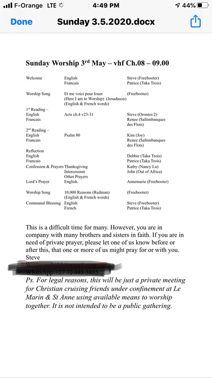 The interest has been so high for our ecumenical, bilingual (English and French) service that we’ve had it every Sunday since! Anyone interested just switches to the VHF station where we meet and follows along with the order of worship that is available by email!