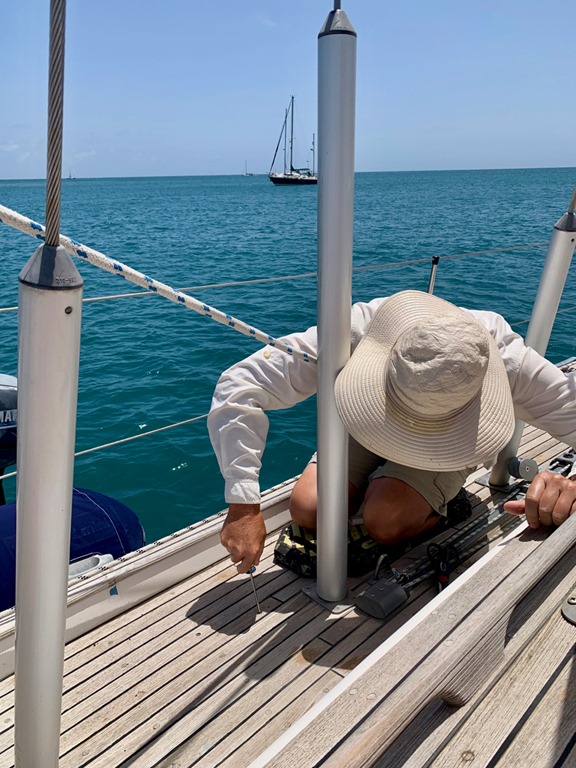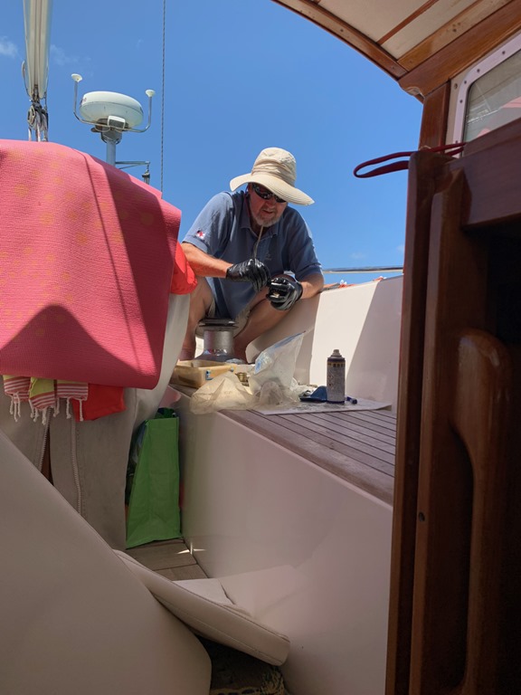 Mark has finally finished the multi-step task of replacing about 200 bungs that came out during Nancy Lu’s time in the boat yard. This has been an ongoing project for the last 10 years. Happily, none of the hundreds that he’s replaced over the years, using the technique he’s developed, have ever come back up! Though this has been a daily occupation, he has plenty of projects that come up and get completed in relatively short order. Such as,