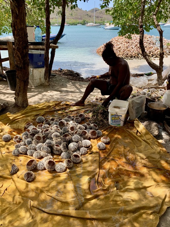 On the way back through Hog Island, we came upon a man working at getting the good-for-eating part out of sea urchins. Behind him, we saw a hill of conch shells discarded over time after the “meat” had been harvested.
