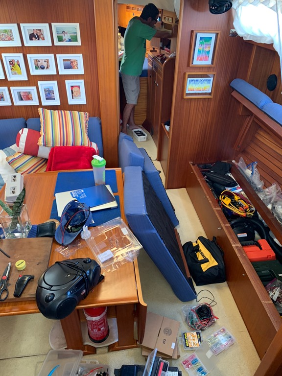 installing an extra fan in the V-berth in anticipation of our daughters’ visit. It’s unbelievable how much upheaval can occur when your garage and tool chest are in the main saloon!