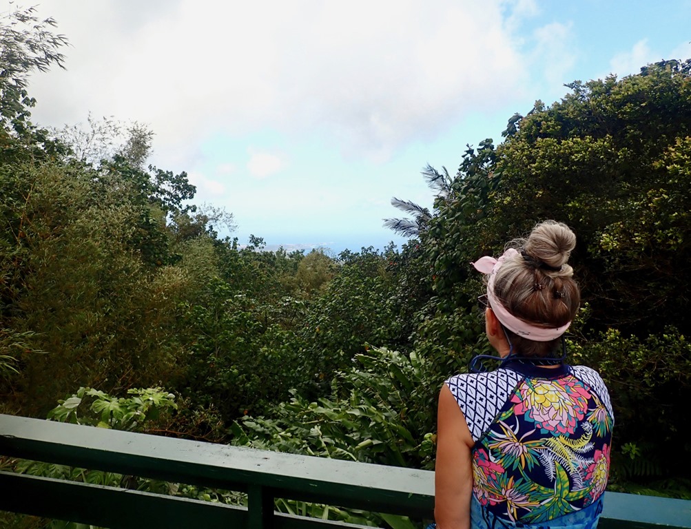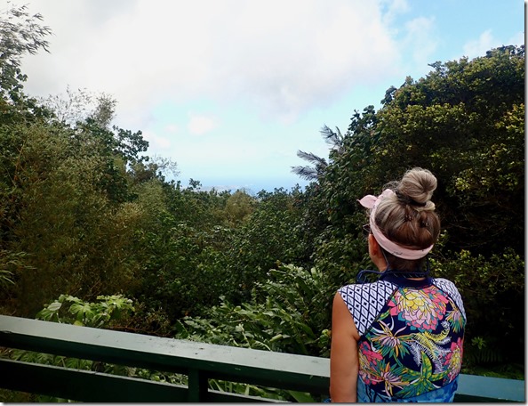 At one of our scenic stops, my body language expressed the temperature drop that occurred as we climbed into the mountain rainforest.