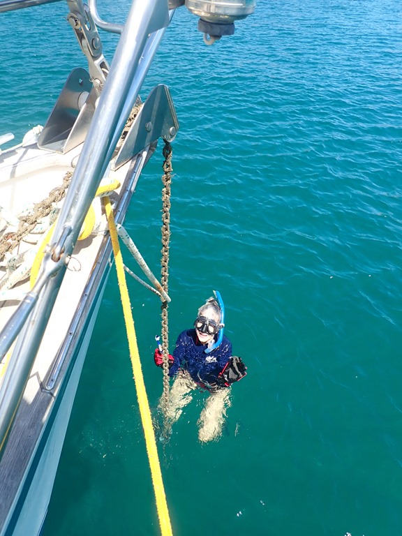 He’s not the only one with daily tasks and other necessary projects to deal with. When we finally moved to a mooring in one of Prickly Bay’s more calm and comfortable spots from the uncomfortable spot where we were anchored for so long, the anchor needed to be cleaned of all the marine growth it had accumulated. If this task was neglected, the dying growth would quickly turn stinky while stored, as it is now, in the anchor locker! So, I got out my snorkel gear, cleaning pad, and a toothbrush to painstakingly remedy the situation as Mark let the chain out of the locker little by little using the electric windlass! Oh, the glamour of boat-life!