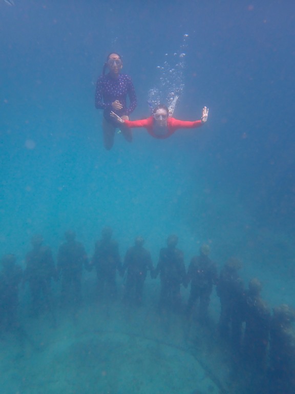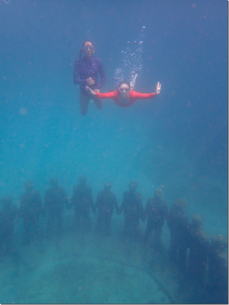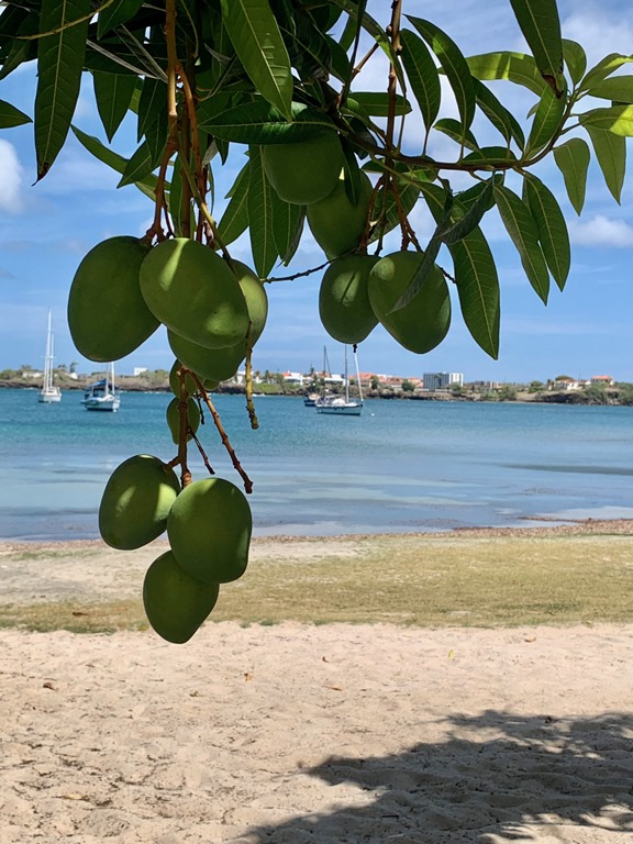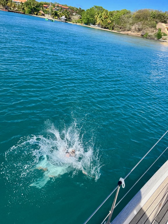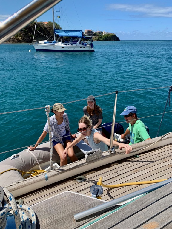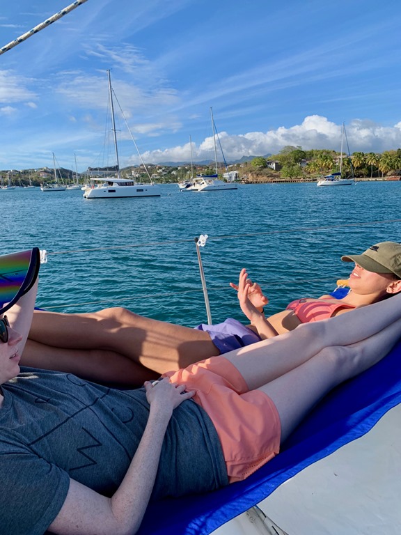A couple of days into their visit, we motored away from Prickly Bay to one of our favorite snorkeling spots in Grenada, the underwater statue park in Moliniere Bay. We spent a couple of rainy days there, enjoying the relative seclusion and, as Claire described it, the Jurassic Park-like surroundings. One of the highlights of our time moored near the statue park was forced on us by an unwanted visit by a swarm of flying ants attracted by the lights in our cabin as we settled down for an after-dinner game of Rummicub! We quickly turned out all the lights and scrambled up on the deck to wait for them to leave. When we settled down and looked up, we were treated to a beautiful starry sky that was revealed after a long break in the clouds! We oohed and aahed at the spectacular display of God’s creation before we decided to turn in for the night. The flying ants had gone, and we had a good night’s sleep before waking up to another unexpected nature-provided treat! The girl’s were in the cockpit sipping on their coffees and teas when Claire cried out, “Manta Ray!” Sure enough, one was leisurely cruising the area around Nancy Lu! Too bad we couldn’t get great pictures, but it was a special experience considering we’ve never seen one in all of our years on Nancy Lu!