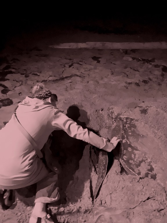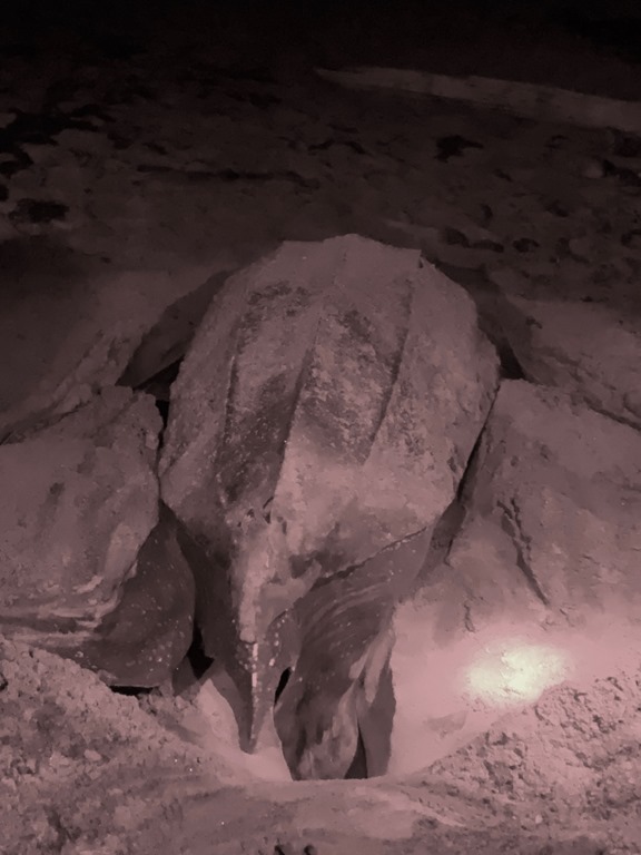 Amy and Marie, the two labor and delivery nurses, and I took Shademan’s bus to Levera Beach in the northeast corner of Grenada to watch the giant leatherback turtles come in from the ocean to lay their eggs! It was an awe-inspiring experience! The girls loved it! It’s always a gamble on whether your visit to the turtles’ nesting beach will coincide with a turtle’s visit, causing you to appreciate even more when one comes in! Something further to appreciate is when mama-turtle comes in early in the night! Ours showed up at 8:45! After watching her for a couple of hours until she made her way back to the ocean and disappeared out of sight and the long ride back to our southwestern bay, we got home around 1:00 a.m., not bad! When Mark, Claire, and I did this excursion a few years ago, Ms. Turtle did not show up until midnight, which made our arrival back on Nancy Lu 4:00am. This is the reason Claire decided to keep her turtle watching adventure to a truly once-in-a-lifetime-experience!