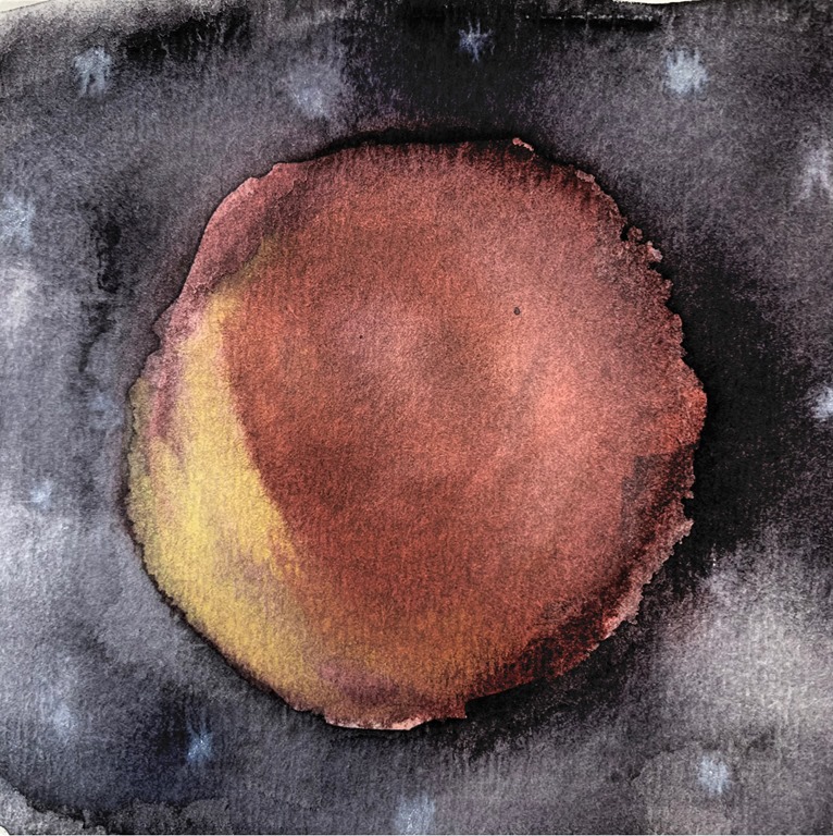 A “blood moon” appeared in the sky during our time at Sandy Island. Thankfully, Mark’s dad, David, texted, telling us about it at about 9:30 p.m. just as it was unfolding in the heavens above Nancy Lu! Otherwise, we would have missed the whole glorious sight! We both spent the first hour watching with our heads sticking up from our bedroom hatch, binoculars at the ready to get a more detailed view as it slowly went through different stages until it got to it’s most other-worldly, beautiful, glowing red stage. I must have gazed at it like that for the next hour as I lay in my bed looking up through the hatch as it drifted in and out of view as we swung on our mooring and it slowly returned to its usual full moon appearance while I drifted off to sleep. I was inspired to try and capture my impressions of the different stages I observed of this special occurrence in watercolor! I love God’s beautiful world that he made for us to enjoy and take care of!