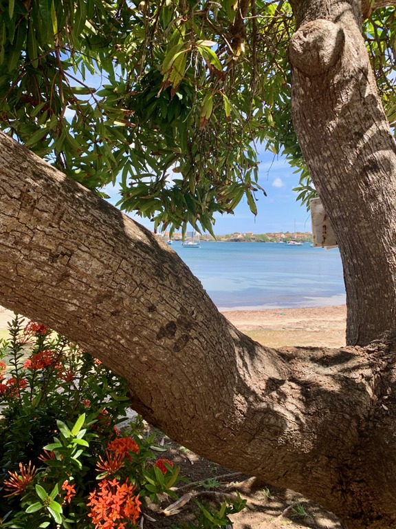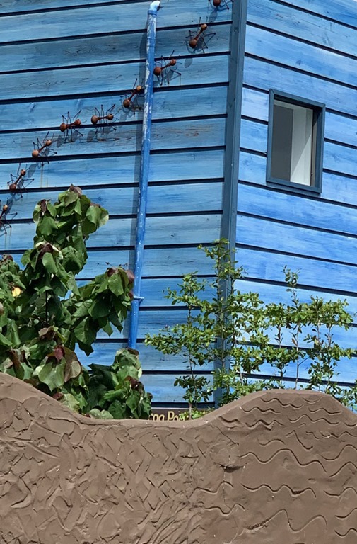 Once we were back in our spot in Prickly Bay, I continued my weekly yoga classes and the nice walk there and back. One of the things I like at True Blue is all the metal sculptures with which they decorate. I don’t know if the ants crawling up the side of one of their buildings, visible from the street outside was new or I was just noticing it, but it caught my attention one morning as I walked back to the dinghy dock where Mark picks me up to dinghy me home!