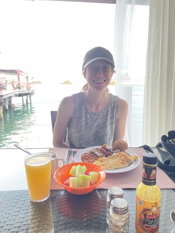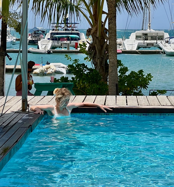 Of course, we let the girls know that Mark was sick(negative test for Covid) before they came. They decided to come anyway. By the time they got here, I had come down with the same symptoms. As a precaution, we put them up at True Blue Resort for two nights. While there, they enjoyed the wonderful complimentary breakfasts, pool time, and complimentary yoga. They ended up boarding Nancy Lu on the same day as Claire.