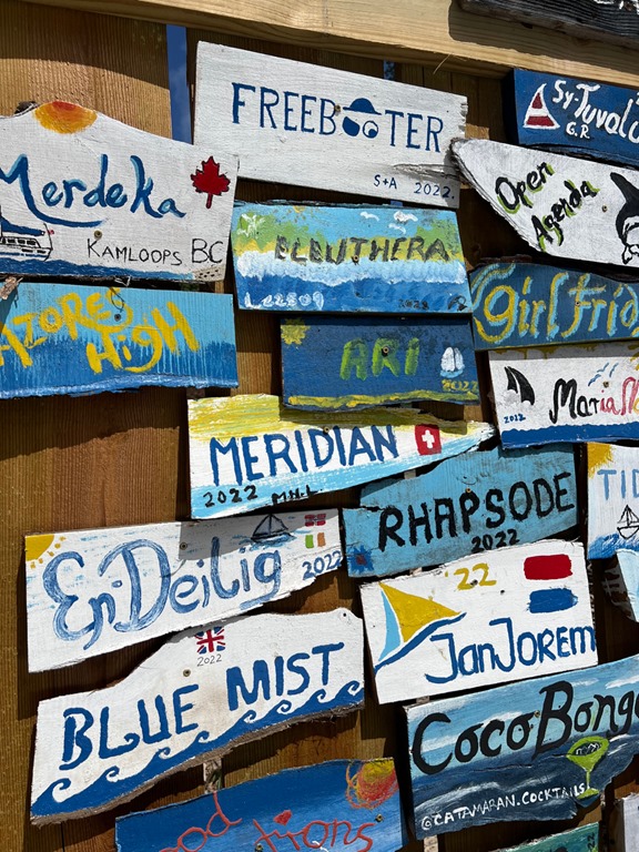 We joined some new sailing friends at Paradise Beach Club on our third and last visit for their weekly “Sip and Paint” event. On our second trip to PBC, we had a scrumptious fish and chips lunch while I used their good WiFi to zoom into my weekly neighborhood ladies’ Bible Study and so we could get a taxi into town to extend our visa. Back to our last trip to PBC…We did not end up doing the painting part of “sip and paint” and we changed the “sip” to munch on pizza, but we got to know Benge and Debbie who had just bought our friends Penny and George’s boat, Star Shot. We did; however, see a lot of other cruiser friends’ painted signs from past “sip and paints” which were displayed all around! Hopefully, we’ll paint a Nancy Lu sign next year!