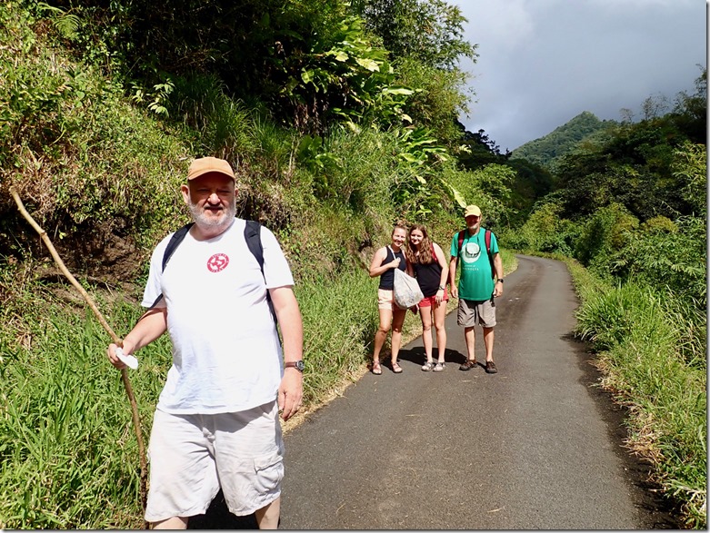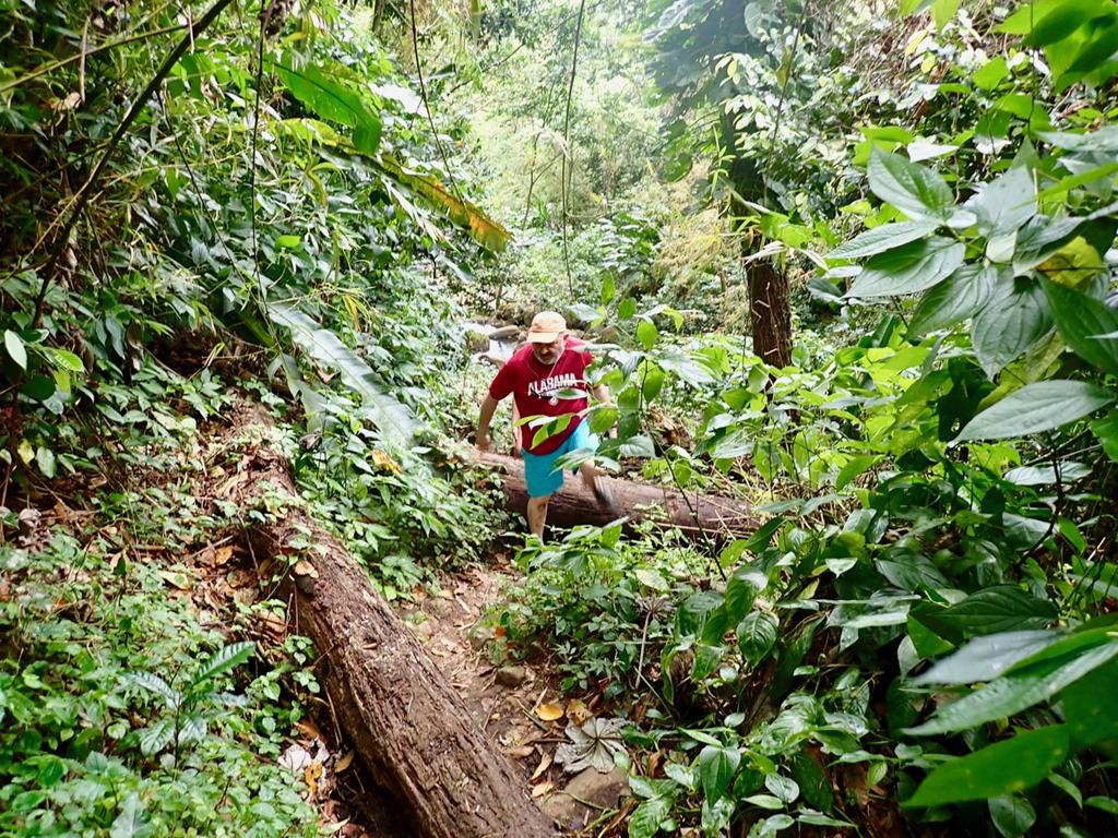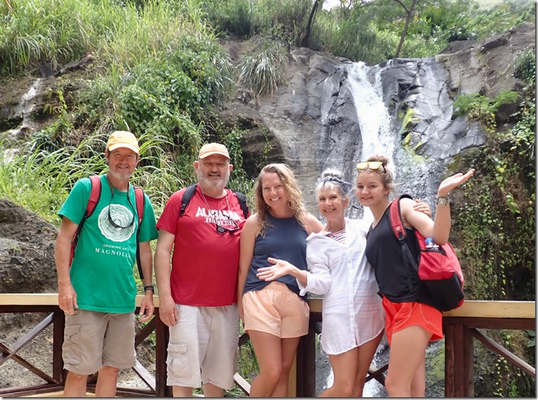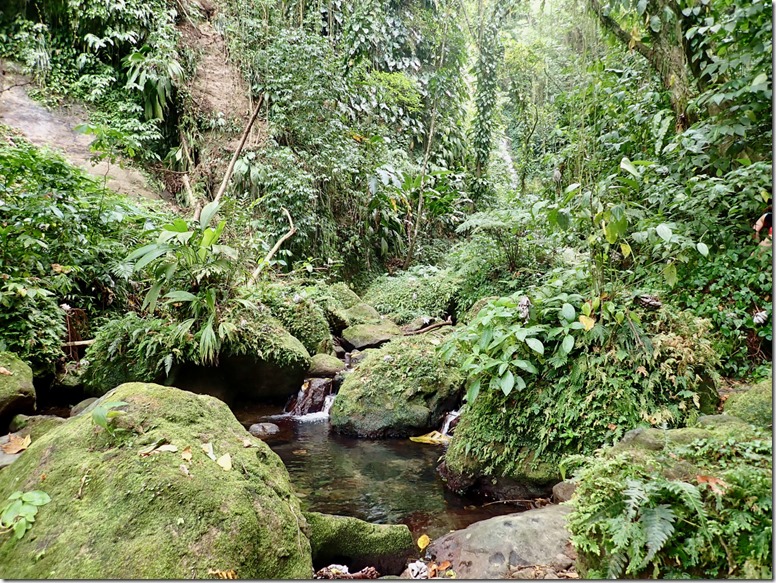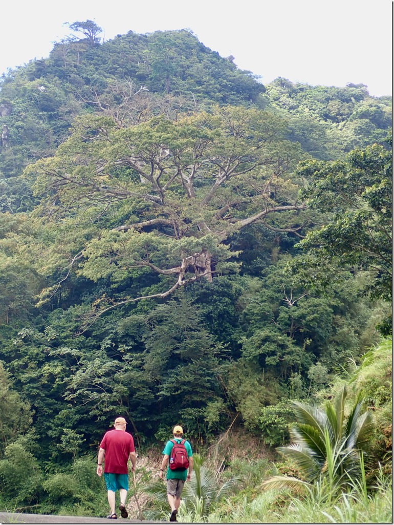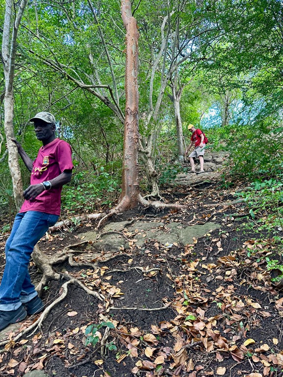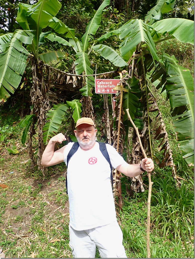 We enjoyed having our “hash guide”, John, but if there was a downside to following him, it was that he opted to lead us down off the ridge using the trail marked difficult instead of the longer but MUCH LESS STEEP and easier choice! This long, treacherous, slippery and steep path down from the high ridge + the paved but equally long and steep hill up to the ridge began Mark’s ongoing argument to convince me that a hash was something our guests might not enjoy. The second way we broke with our normal hashing traditions was taking advantage of the fact that we got there on our own and leaving earlier than normal to walk across the street to the Spice Isle Mall and do a little grocery shopping at the IGA before catching a bus home.