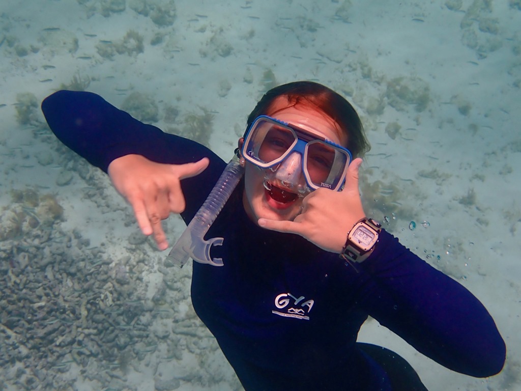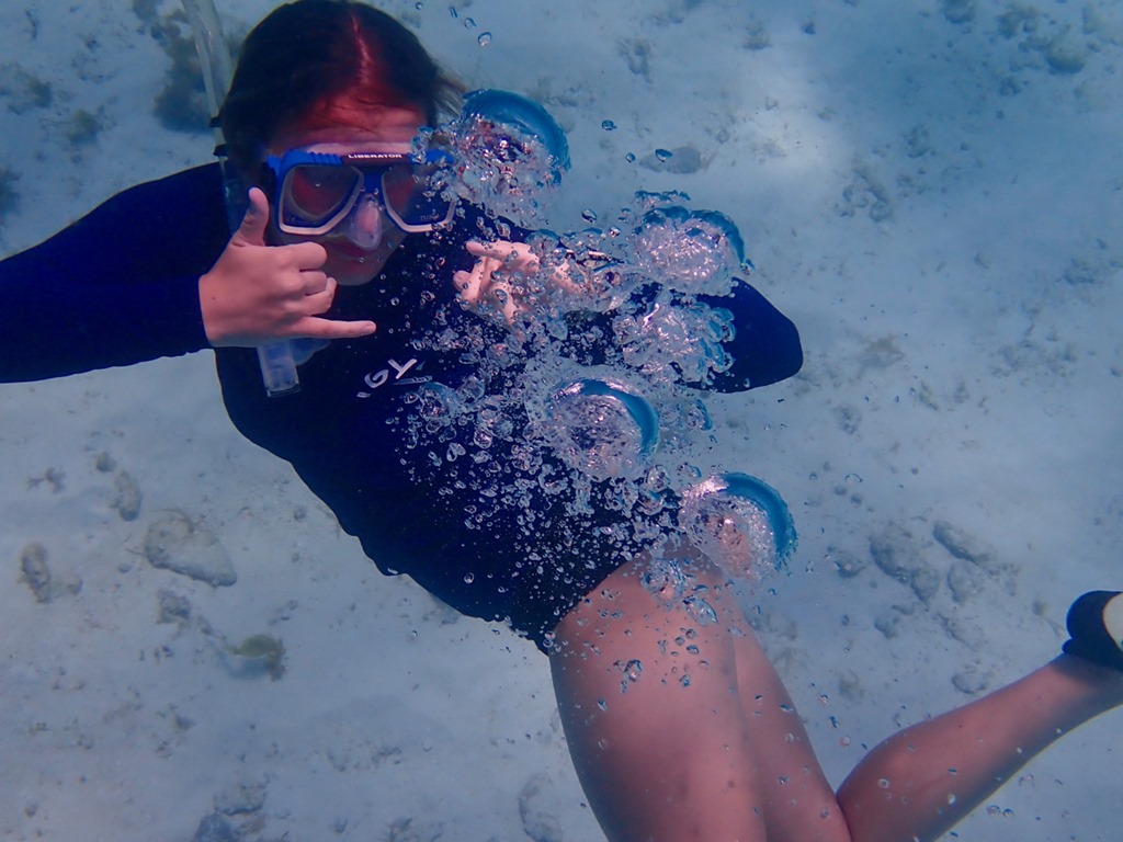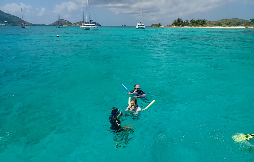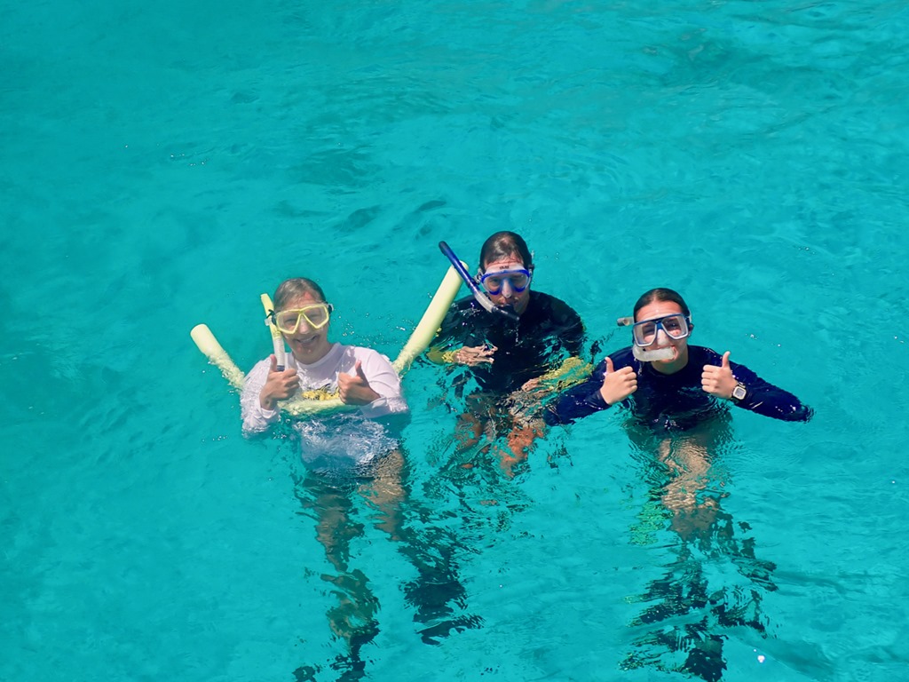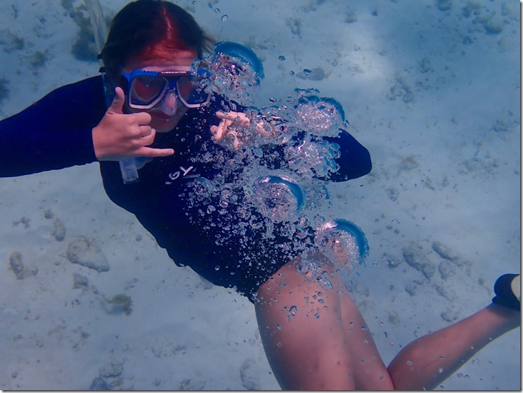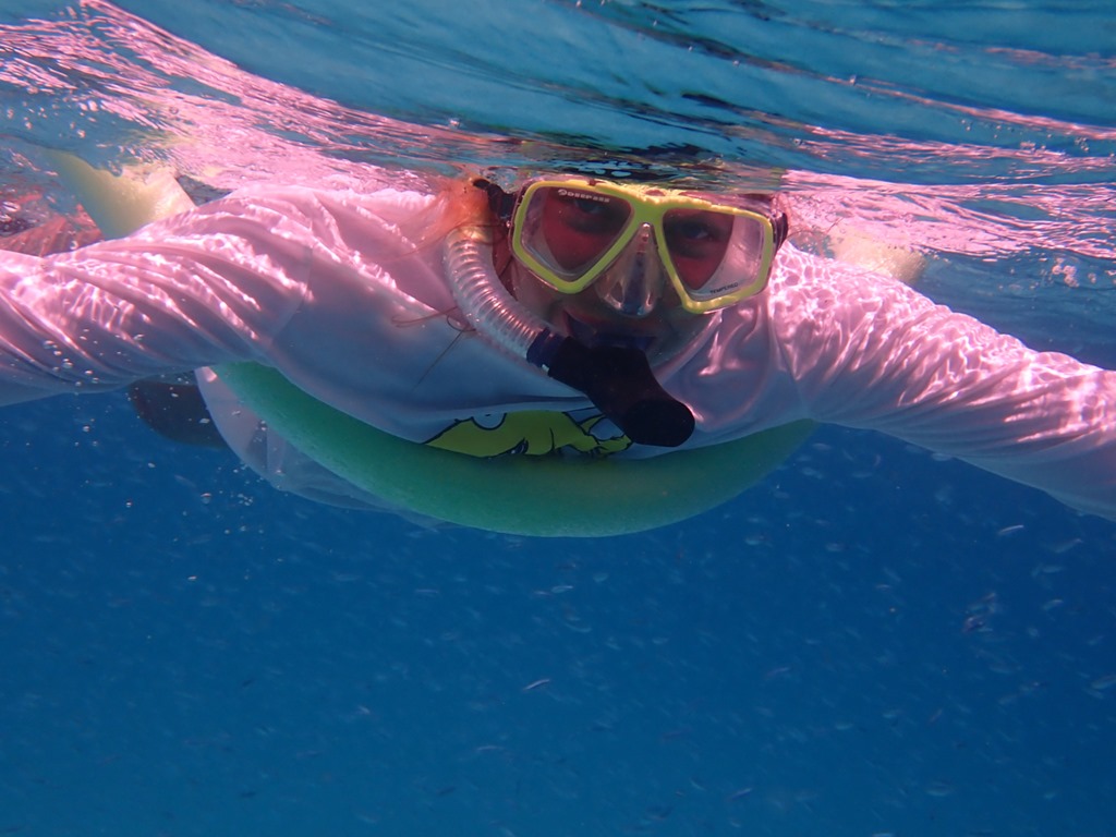 Once we got moored, the girls tried on their snorkeling gear and took a little swim around the boat.
