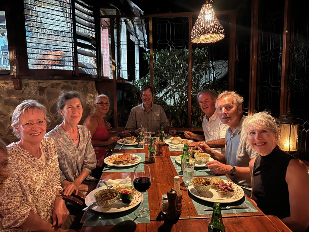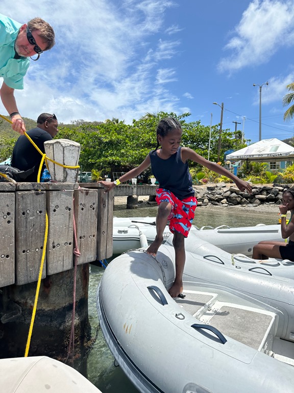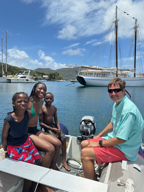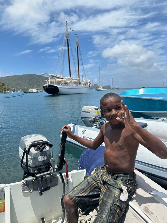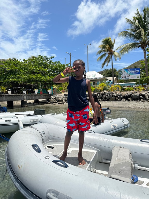 After church and a post-church coffee social with friends at the nearby restaurant, Marie’s, we encountered some kids enjoying their Easter Sunday down at the town dock. The little boys were not shy about asking for a ride on our dinghy, and Captain Mark was amenable to the idea. Big sis asked if she could also come along, and we took a short little spin out around the Bequia-built, wooden ship, Friendship Rose, before dropping them back off at the dock and heading back to Nancy Lu! What fun!! If we thought our Easter Sunday festivities were over for the day, we were happily mistaken! Not long after we got home, we got a call from Annemarie and Steve to meet them along with Heinz and Margrit over on Freebooter for more coffee, tea, and sweets! This had always been the plan, but since we were joined for church by other boaters, we all went for post-church coffee together. I was very glad to get some delicious coffee aboard Freebooter because the iced coffee I ordered at Marie’s was truly lacking! I quickly mixed up some of my watermelon lemonade to share, and we popped on over. We all stayed and visited so long that reservations were made with The Open Deck restaurant and a water taxi to transport us for dinner! For this extroverted introvert, this was QUITE a day! But I have such fond memories, and that is why I wanted to record it all here even though I know it is probably TMI