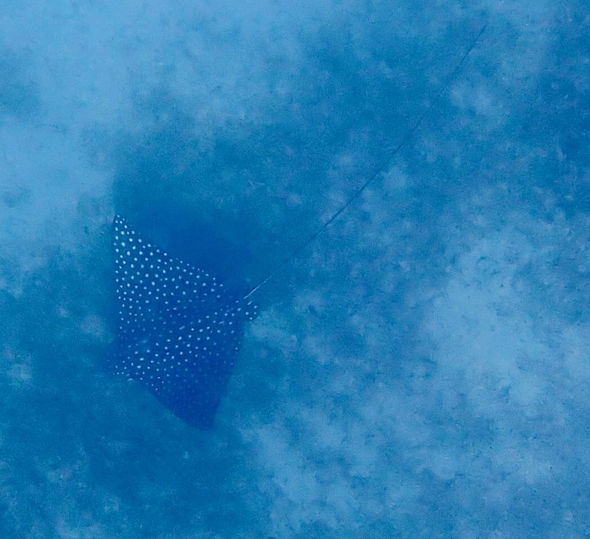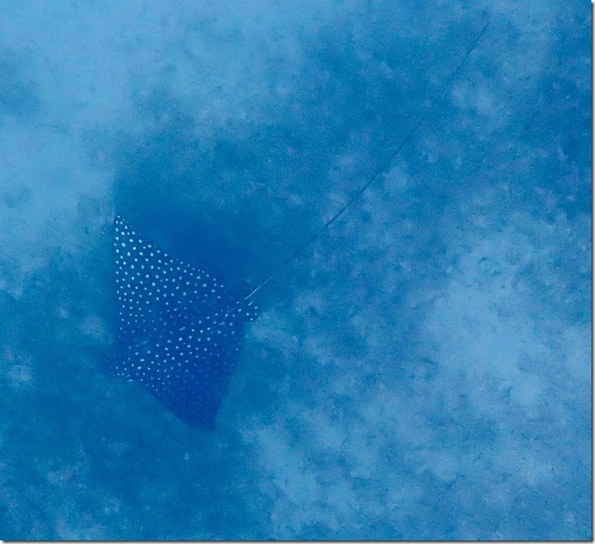 Due to the crowd, we chose an anchoring spot closer to the south side of the bay and are in that same area today! As soon as we dropped the hook, I dove to see if we were set well, and I was rewarded with a sighting of a beautiful spotted eagle ray!
