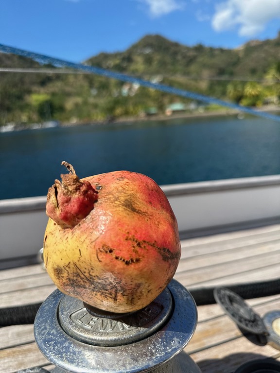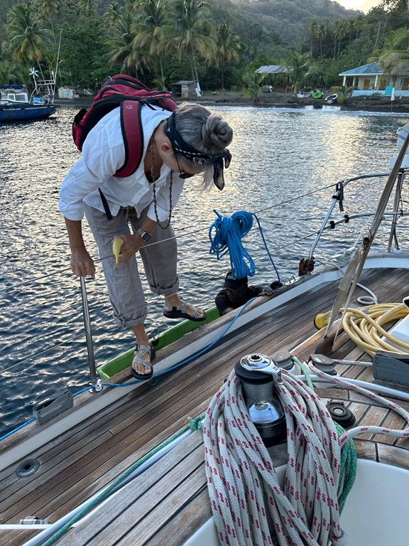 I thought I would be home free once we got to the flat terrain of the gorge and the beach, but by then, just walking was a great effort and killing my feet. A further hike to a waterfall, which was part of our original plan, was OUT OF THE QUESTION, and Billy didn’t even mention it! When we got to the beach, Mark called the taxi and we took it to where we caught a bus. We rode the bus back along the hairpin curves back to Cumberland Bay. Because of the pain of my wrist and my battered feet, I was struggling with everything from getting back on the boat to taking my much needed shower until I made it into bed EARLY that night. I thought I was going to be dealing with a long period of healing for my wrist. I was stressing about how I was going to deal with normal daily activities like cutting up a bunch of mangos that I needed to get in the freezer, but when I woke up in the morning, my wrist was back to normal and Mark’s and my muscles were hardly sore at all! I had planned on recuperating on the boat the next day, but since we felt fine, we decided to sail back to Bequia and resume the holiday atmosphere that we had left just 2 days before with an “epic hike” under our belts!