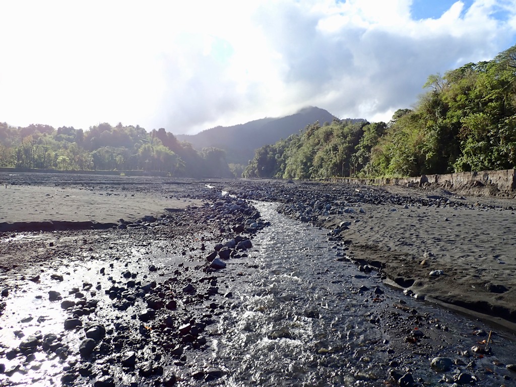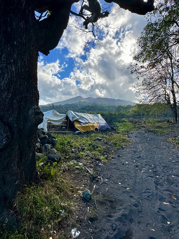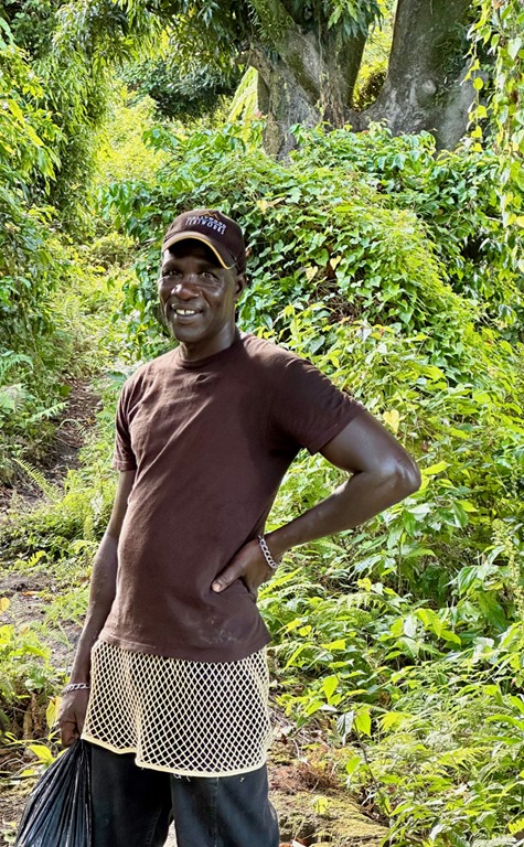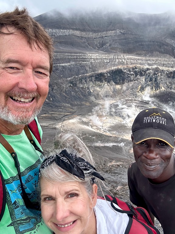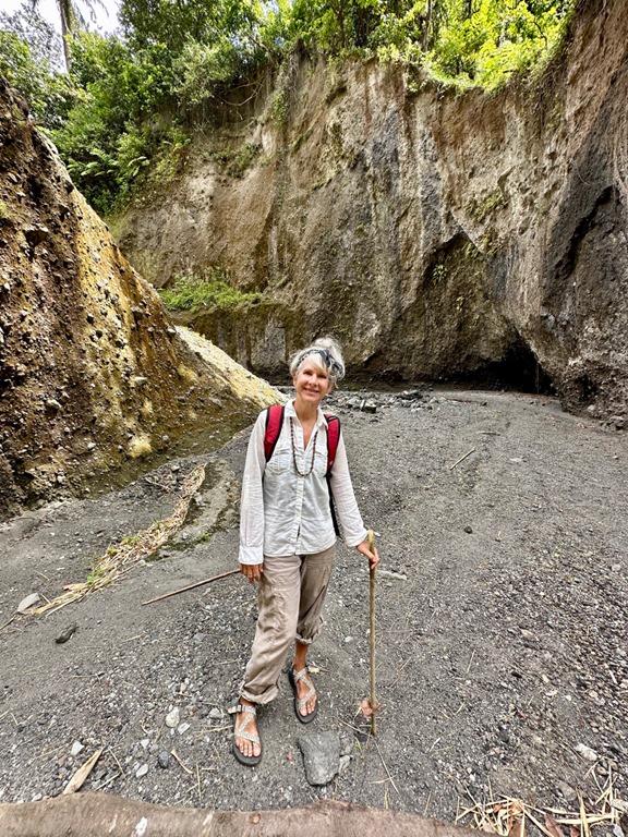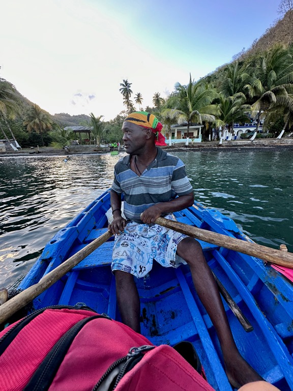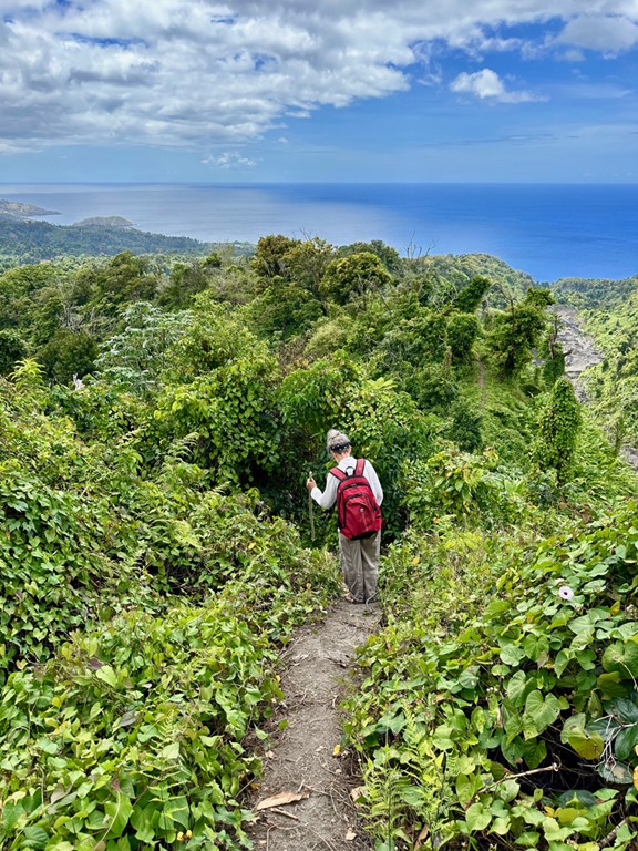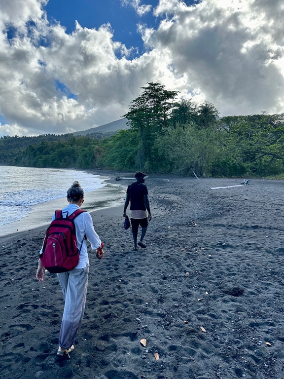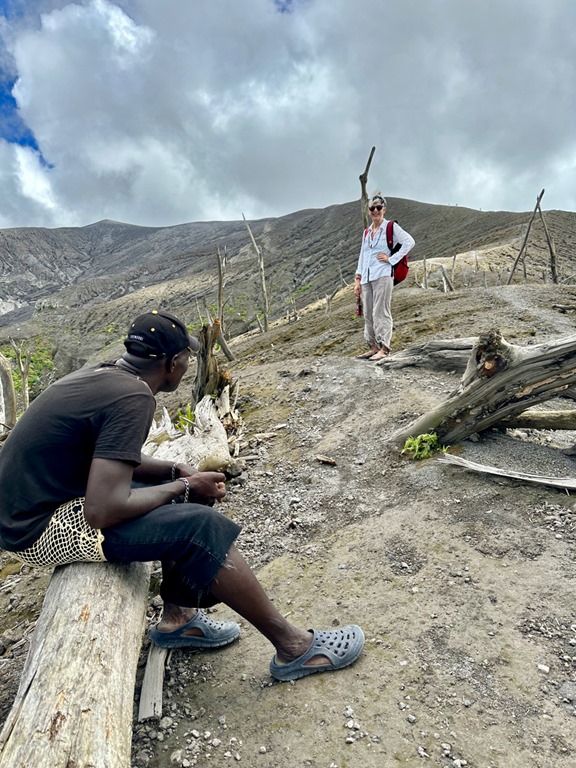 With the guidance of ‘’our boat boy”, Billy, who rowed out to meet us at the entrance to the bay, we dropped the anchor in about 50 feet of water. He then rowed to shore with the very long line that we had at the ready (+ another one we had to tie together with it) and tied it to a palm tree. It all went very smoothly, and plans were made to let Billy guide us on a hike to a volcano and waterfall the next morning at 6:30! This start time clued us into the fact that this hike might belong in what I call the “epic hike” category. The only other hike of this category we’ve done was in April, 2019 to the Boiling Lake on the island of Dominica. Admittedly, we had not researched how strenuous of a hike this April, 2023 adventure would be. We just knew that this was a common tour for which tourists hire guides and that our friend, Peter, on S/V Rhapsode had done the hike and paid about the same price as we had agreed upon with Billy to taxi us to the trail and guide us to the volcano.