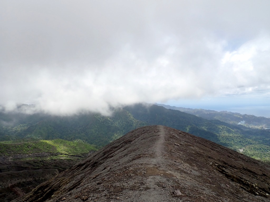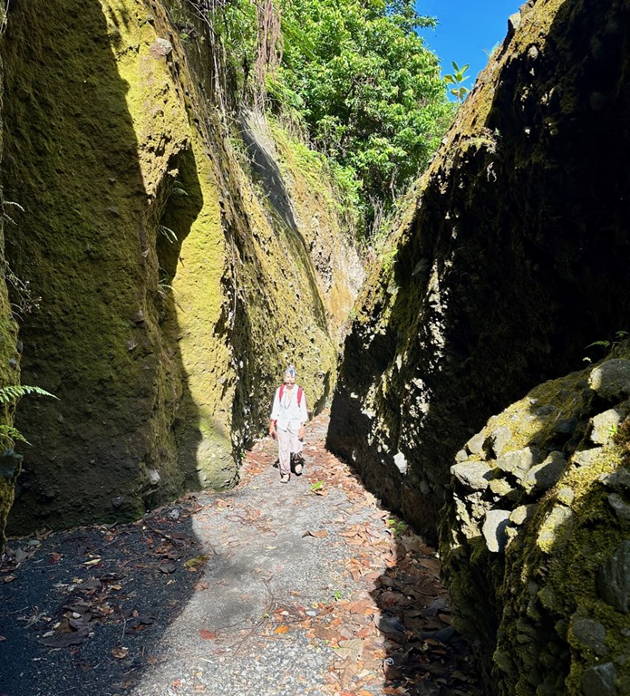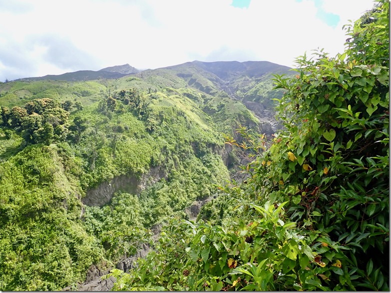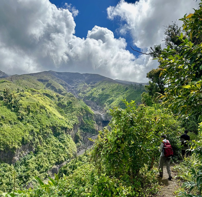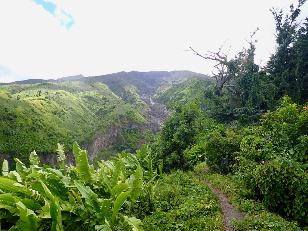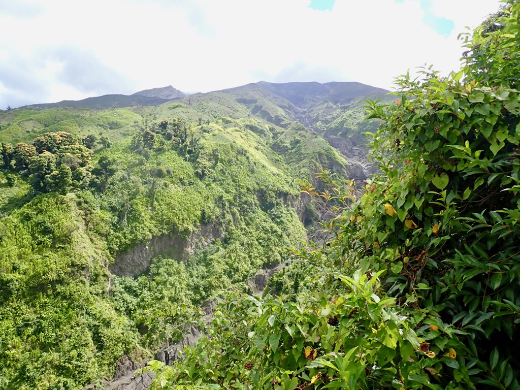 The views were spectacular, and once I relieved myself in the bush, I was better able to enjoy the journey. Still, looking ahead and seeing how much farther we had left to go through the haze in the distance, was a bit discouraging, especially taking into consideration that we were not yet to the halfway point! We began to see great carved out trenches where lava flowed down the mountainside, which was the first phase of the 2021 eruption. The next phase was an explosive eruption that sent ash 32,000 feet in the air and covered the island with ash. There was even a pyroclastic flow, one of the most deadly kinds of volcanic eruptions. No lives were lost thanks to early evacuation efforts, thank goodness!