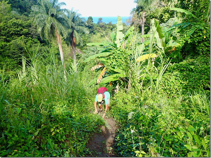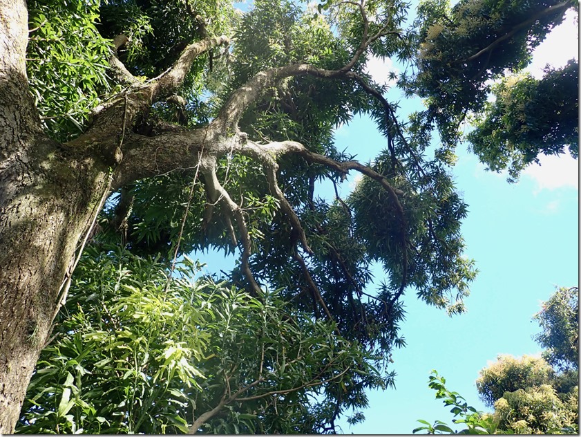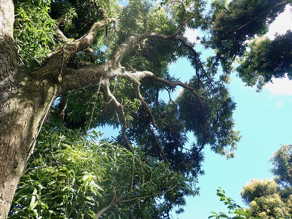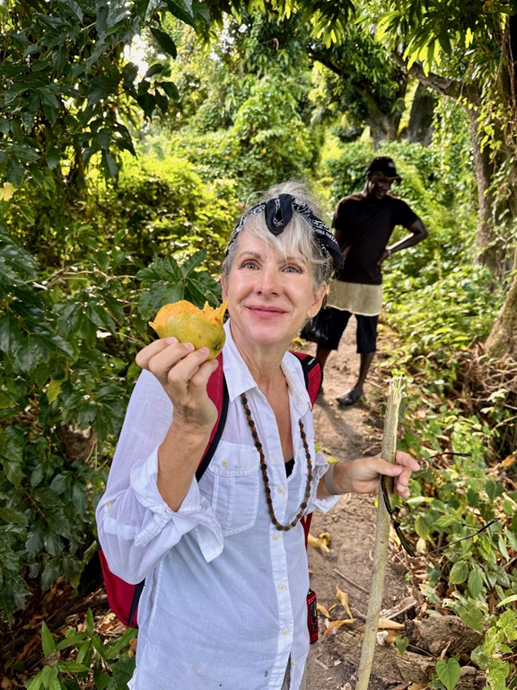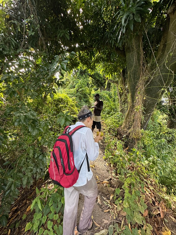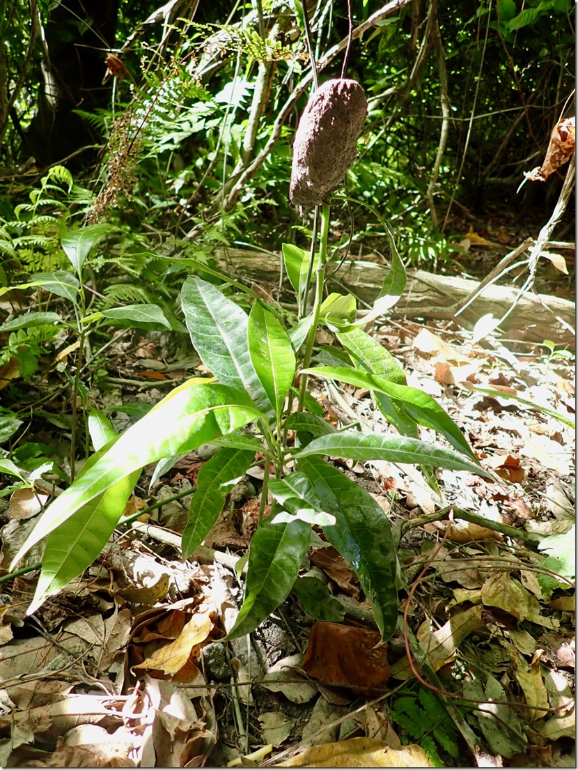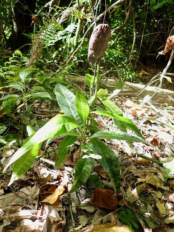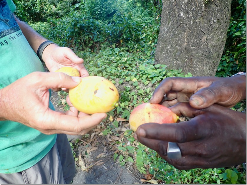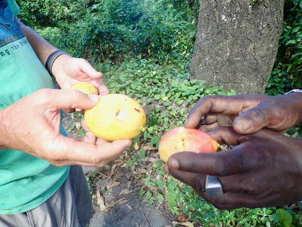 The section of the trail with giant mango trees laden with ripe mangoes was a treat for us because Billy proved to be very skilled at throwing something heavy like a log up in the branches to knock the fruit down! He was also skilled at finding where the fruit landed and hustling through the bush to retrieve it! I ate it as Billy did, skin and all!
