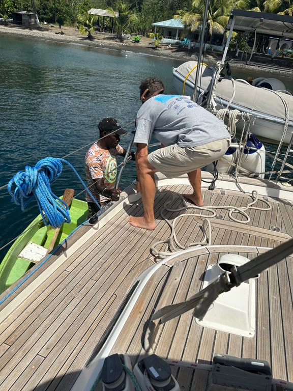 We had a very nice sail to Cumberland Bay. We were prepared for using the services of a “boat boy” to tie our stern to a tree on shore to allow all the boats to fit in the bay of which the sea floor is very deep right up to the shore.