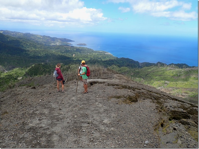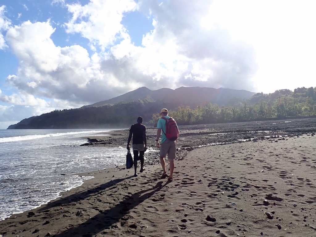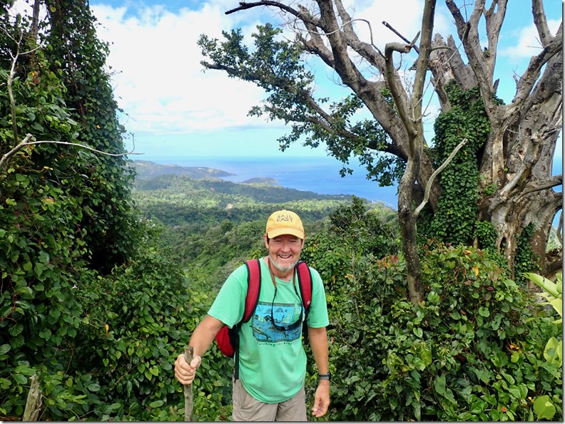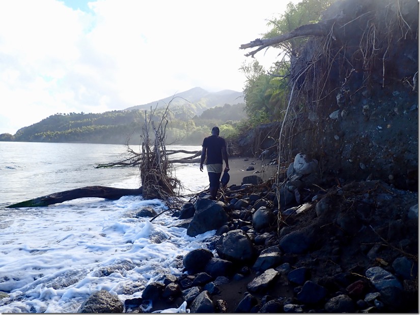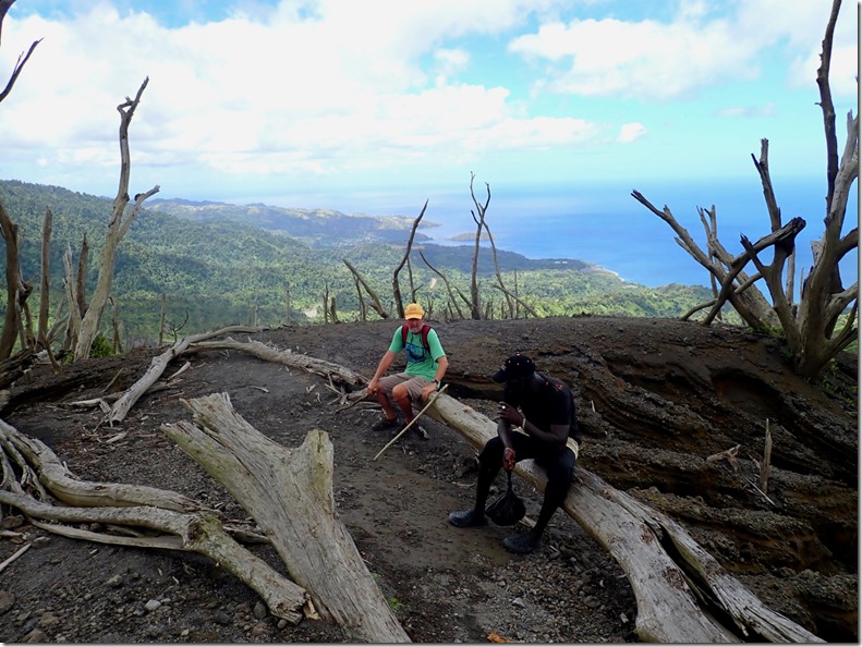 The walk along the black sand beach was longer than I expected it to be, and I was already needing to have a “bathroom” break. I was not convinced that I was up for the adventure, especially when Billy told us he thought the hike would be 3 hours up and 2 hours down. We later learned that hiking up to the volcano from the west side of the island as we were doing was a short car ride from Cumberland Bay to the beginning of the hike, but a longer and more difficult hike to the summit; whereas, the hike from the east side of the island was a very long taxi ride from Cumberland Bay with a shorter and less difficult hike to the summit. That’s what our friend, Peter, had done. We committed ourselves and felt safe under Billy’s guidance. I took comfort in the fact that it was just the two of us so we could turn back at any time. I assured Billy we would pay him the full amount even if we decided not to go the whole way. On we went…