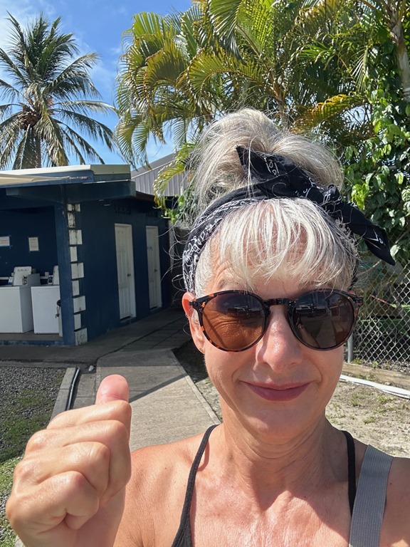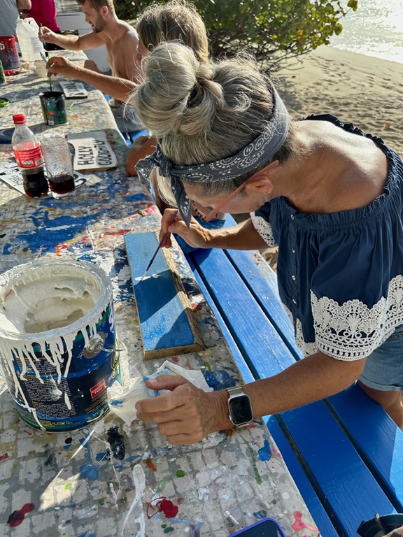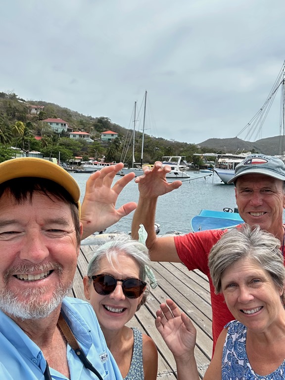 Speaking of new friends, we met Dan and Lori on S/V BeBe for the first time here in the Caribbean at our first Sunday afternoon dominoes session.  We were all at Baylor University together back in the 80s, but never met there!  A few years ago, Lori and I became aware of each other and our similar lifestyles through a mutual Baylor friend, Debi Herschelman Palmquist.  Lori and I were introduced to each other by her at a Baylor homecoming that we both attended.  I remembered being told about Lori, but I couldn’t remember if we had actually met, but since then, Lori and I have been corresponding through Facebook Messenger. We finally crossed paths in Bequia this year!  After lunch together one day, we got a picture holding up our bear paws for a “Sic ‘Em Bears” pose.  The heel of my hand was healing nicely!