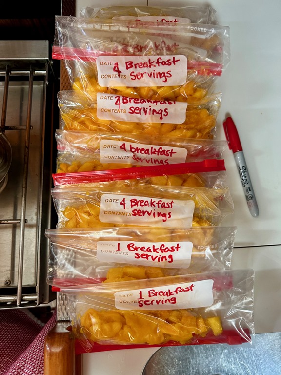 Soon after we sailed back to Bequia from Cumberland Bay, St. Vincent, I cut up those mangos, feeling thankful that I could do so after the injury to my wrist on the way down from the volcano’s summit in St. Vincent!  I still count it a blessing that I woke up feeling fine the next day after that epic hike!  Into the freezer the mangos went!