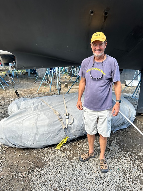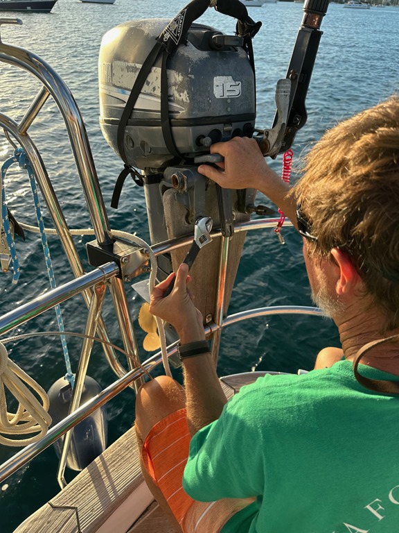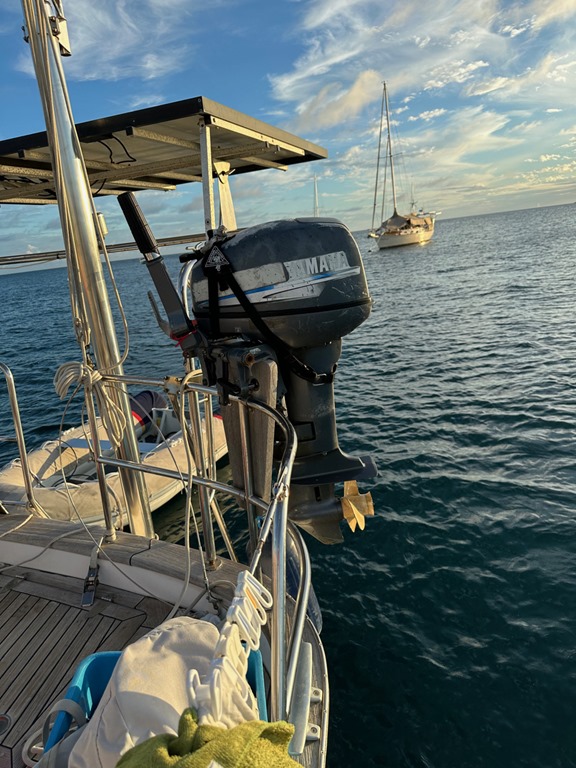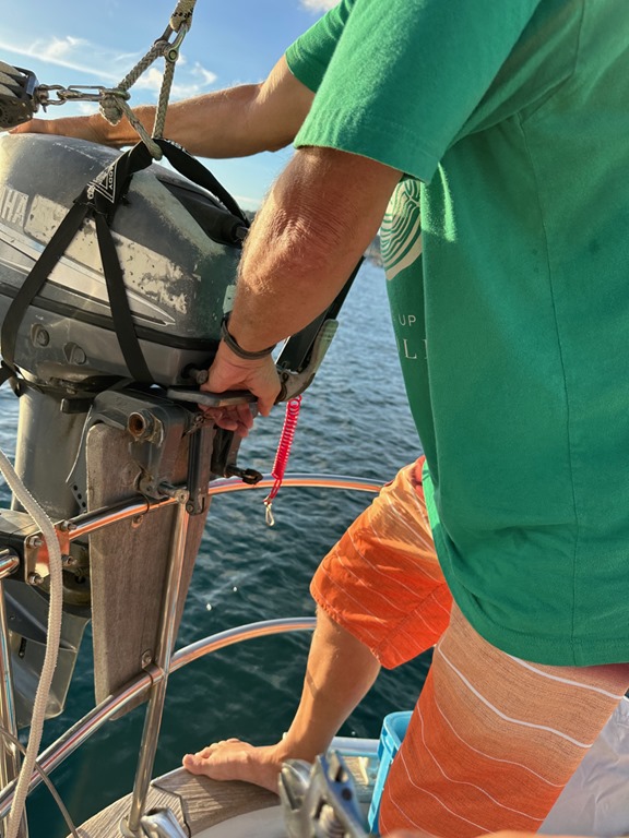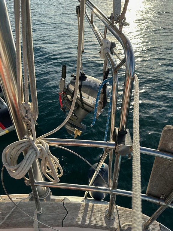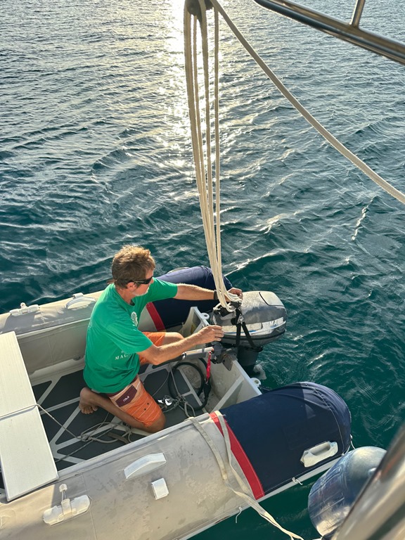 and lifting the dinghy motor off the dinghy for storage (making sure the whole process was thoroughly, photographically documented for posterity, hahaha), and hoisting the dinghy on the davits for the last time (apparently, thoroughly documenting that task was neglected, hahaha).